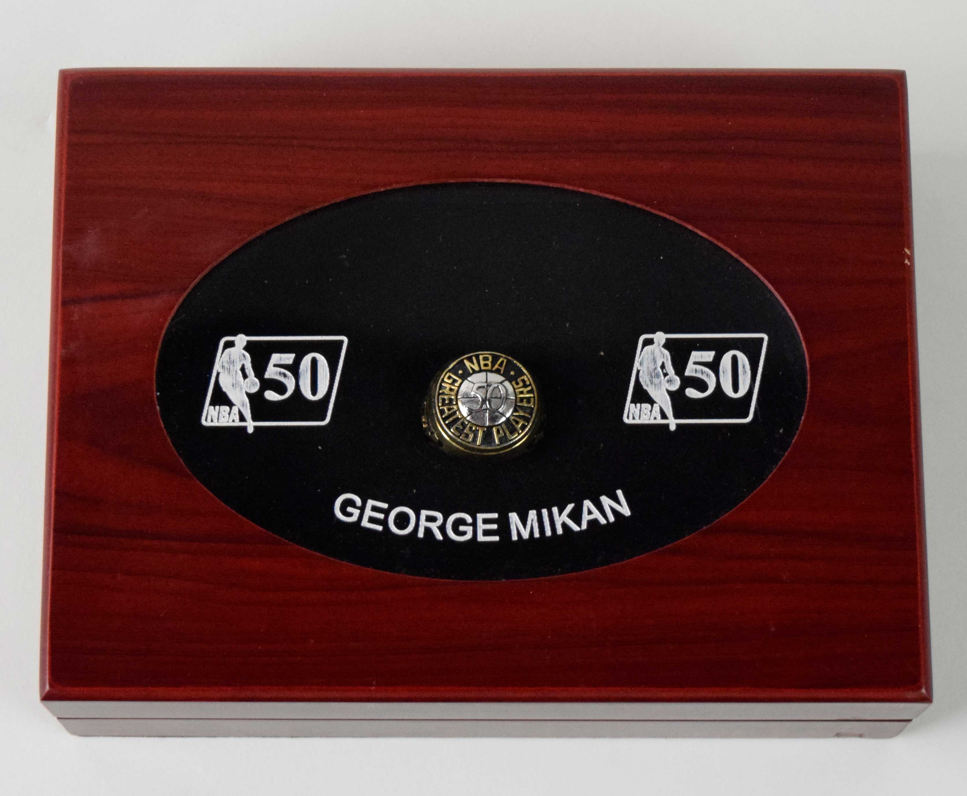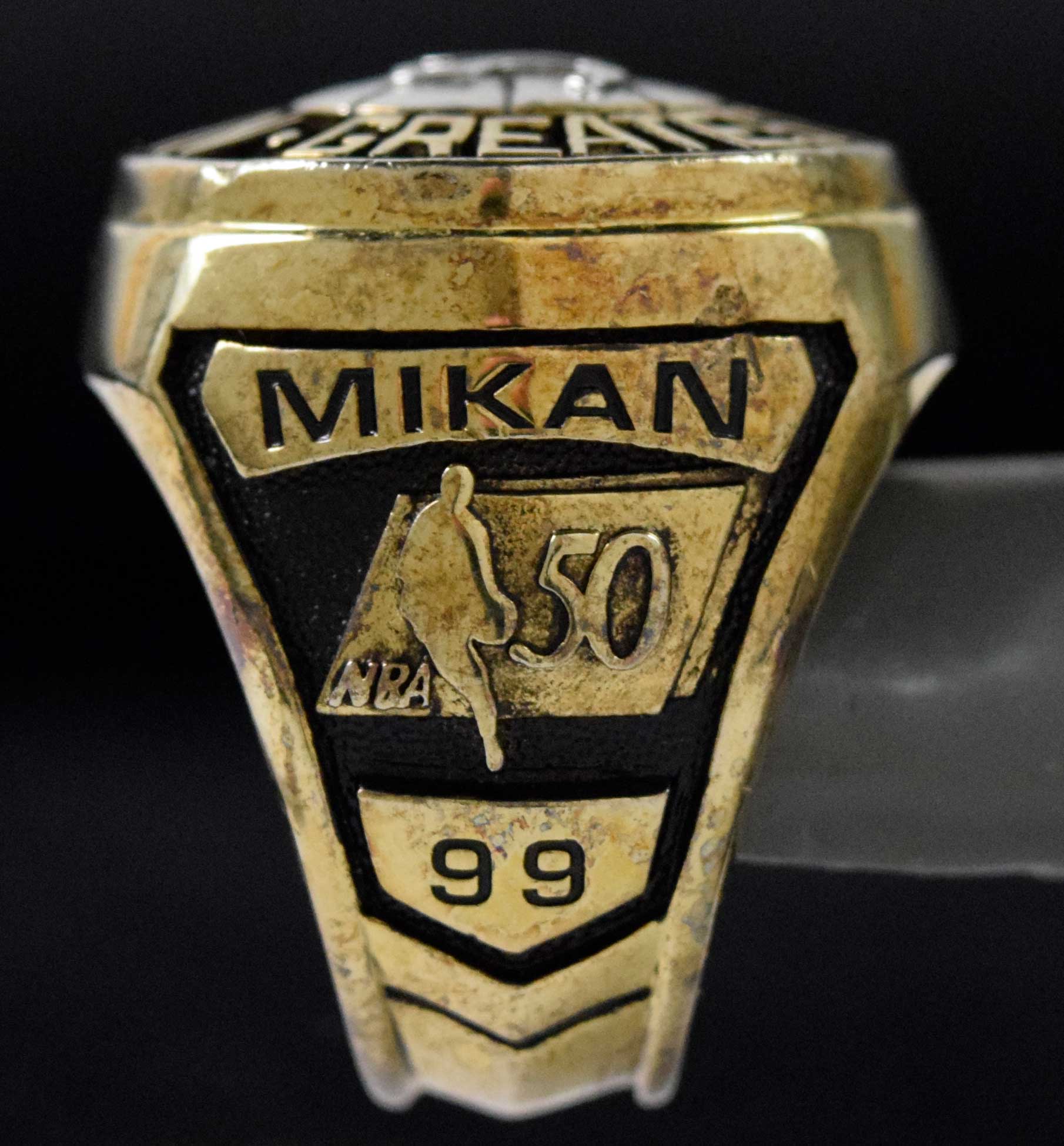 Description:George Mikan NBA 50 Greatest Players Balfour sample ring (EX-NM) Replica of the ring which was presented to Mikan for being named a member of the NBA's list of 50 greatest players. On the top face is the "50 Greatest NBA Players" crest. One shank the NBA logo with "1946 1996" years, opposite has "Mikan" name and number "99". Marked "LGB Sample" inside. Size (13)-(13.5) with a hint of light surface tarnish and includes a presentation style box: EX-NM ($1,000-$1,500)