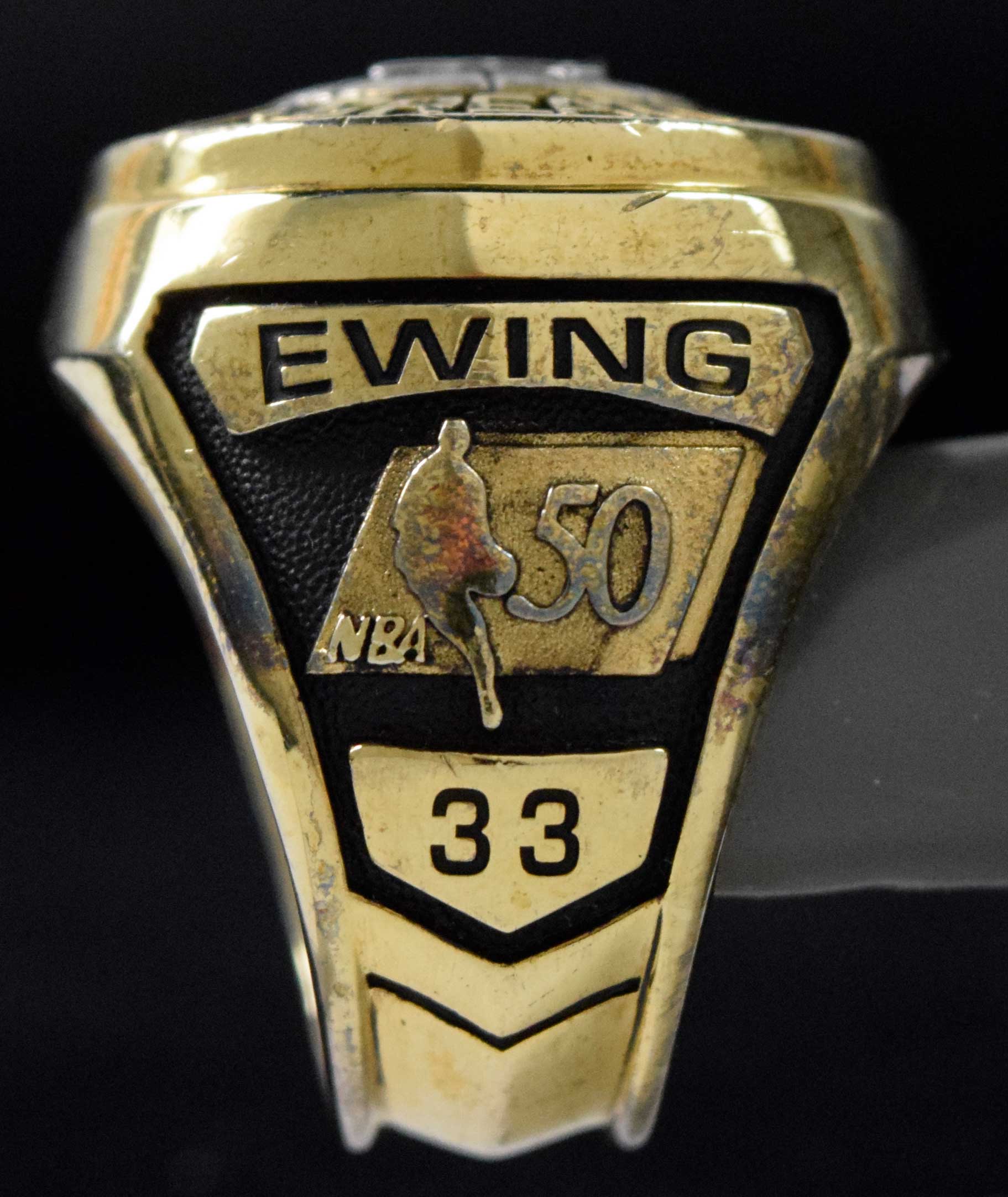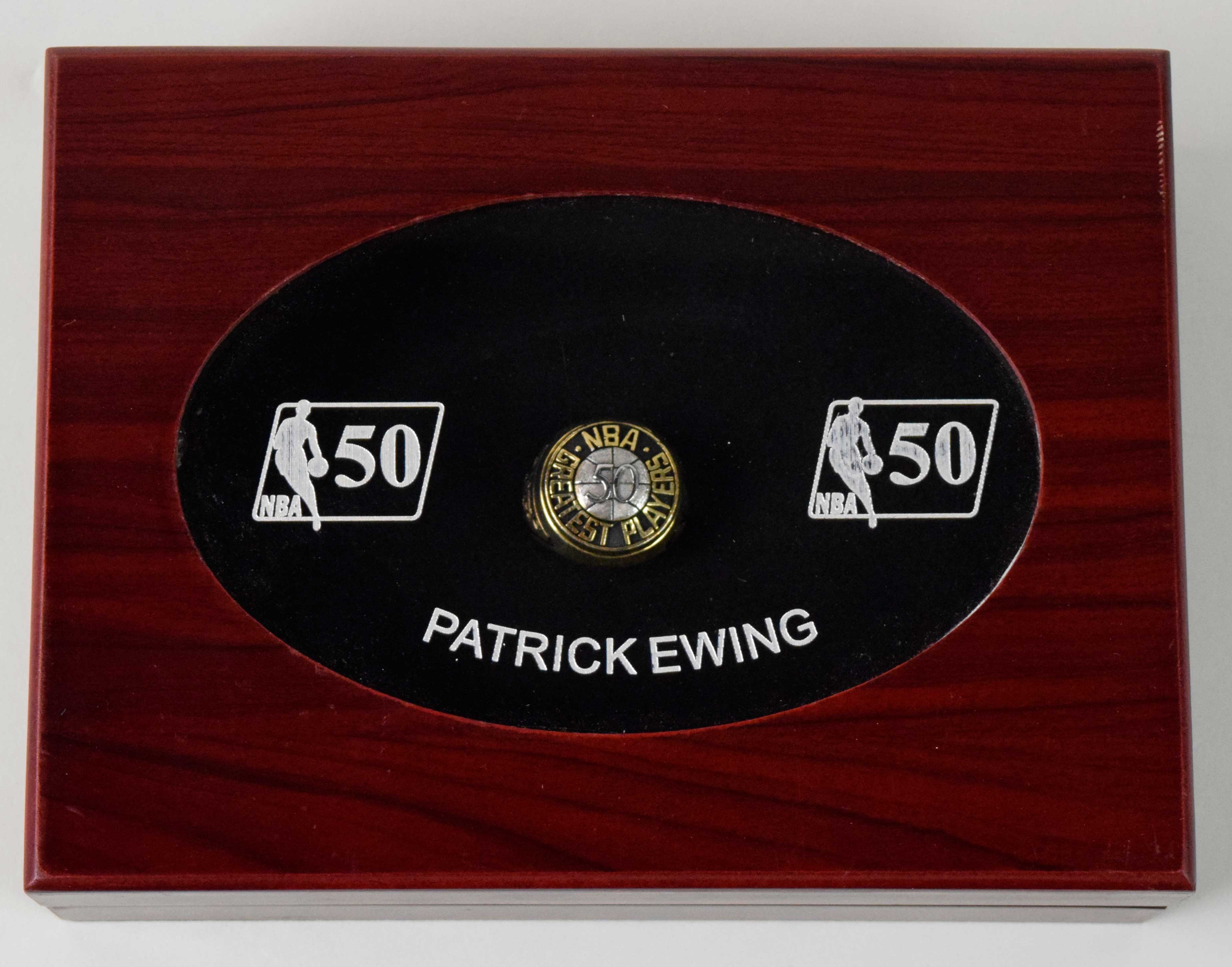 Description:Patrick Ewing NBA 50 Greatest Players Balfour sample ring (EX-NM) Replica of the ring which was presented to Ewing for being named a member of the NBA's list of 50 greatest players. On the top face is the "50 Greatest NBA Players" crest. One shank the NBA logo with "1946 1996" years, opposite has "Ewing" name and number "33". Marked "LGB Sample" inside. Size (13)-(13.5) with a hint of light surface tarnish and includes a presentation style box: EX-NM ($1,000-$1,500)