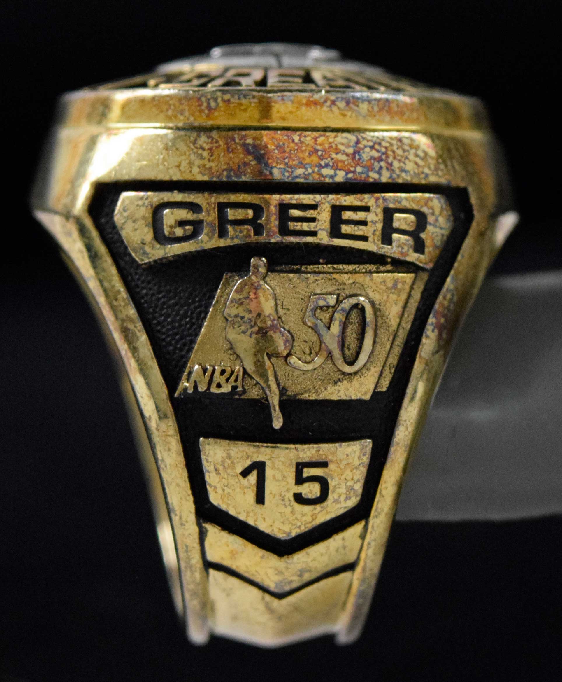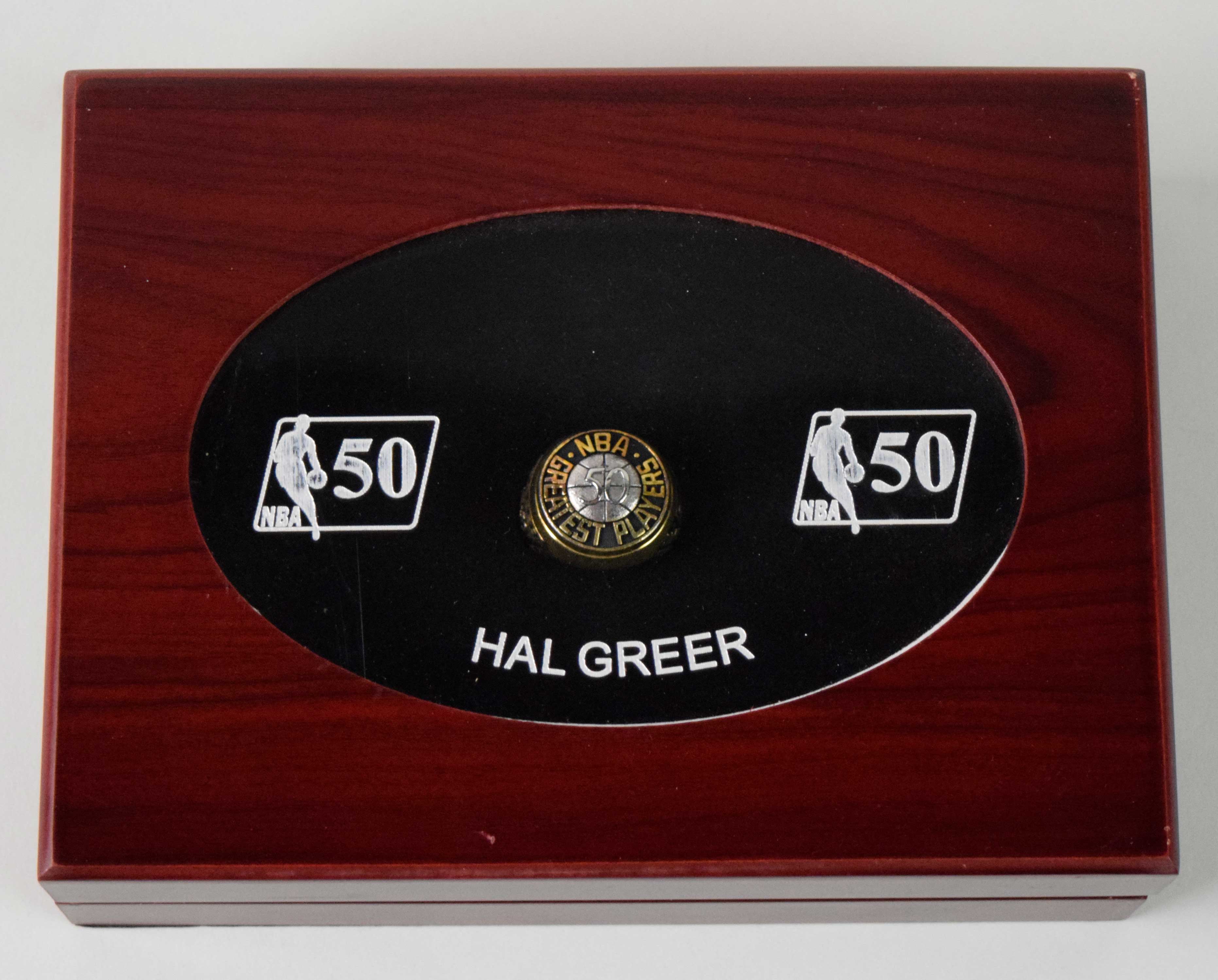 Description:Hal Greer NBA 50 Greatest Players Balfour sample ring (EX-NM) Replica of the ring which was presented to Greer for being named a member of the NBA's list of 50 greatest players. On the top face is the "50 Greatest NBA Players" crest. One shank the NBA logo with "1946 1996" years, opposite has "Greer" name and number "15". Marked "LGB Sample" inside. Size (13)-(13.5) with a hint of light surface tarnish and includes a presentation style box: EX-NM ($750-$1,000)