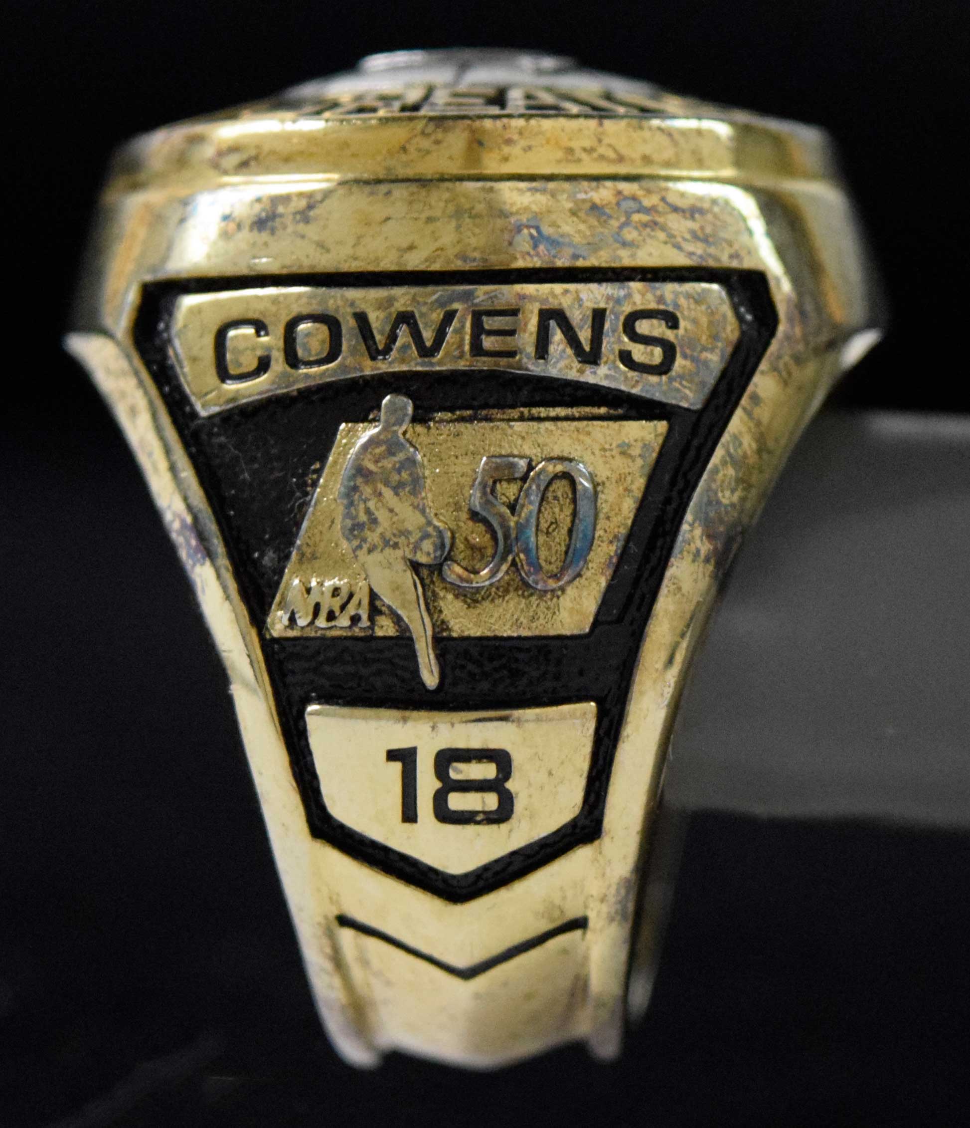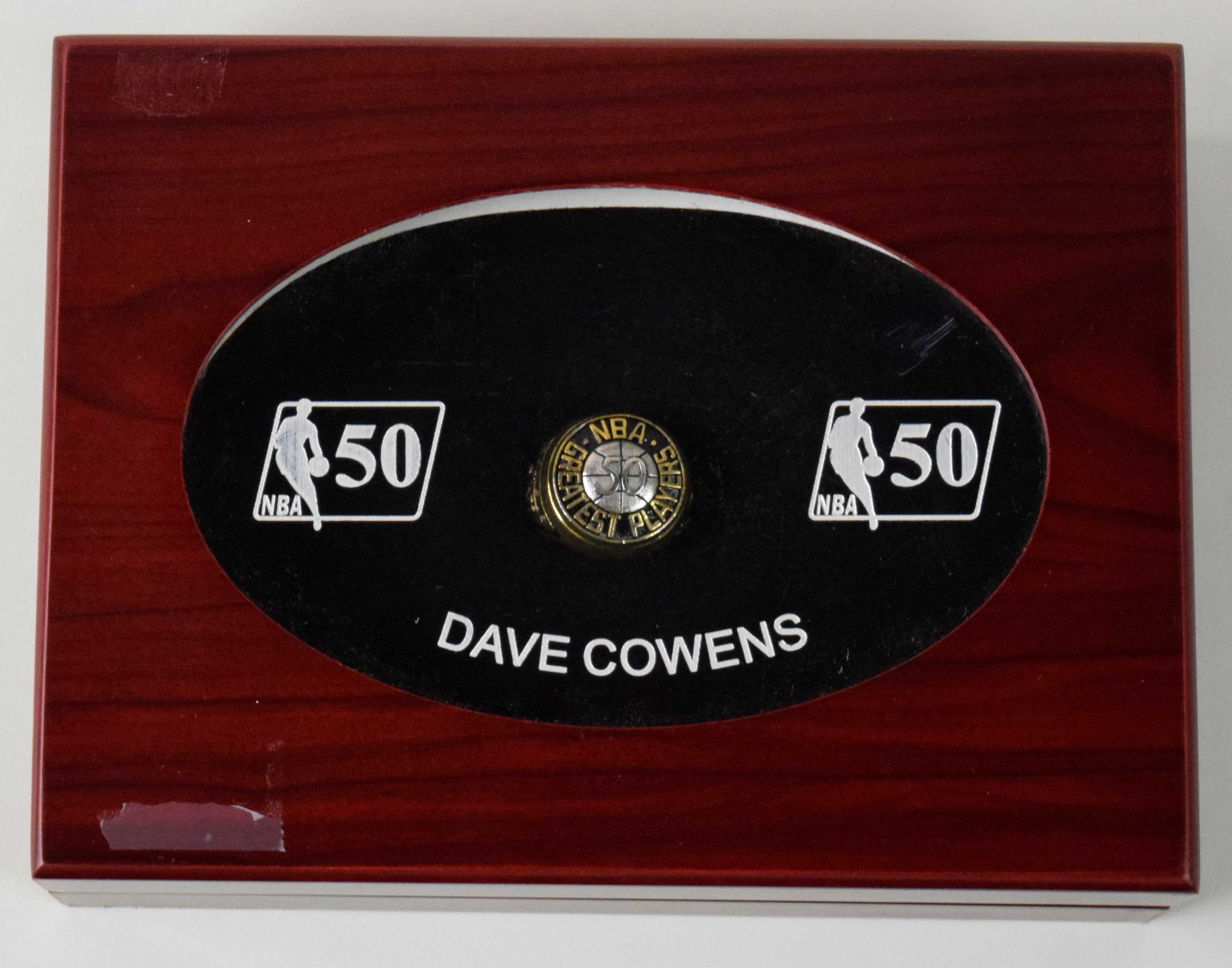Description:Dave Cowens NBA 50 Greatest Players Balfour sample ring (EX-NM) Replica of the ring which was presented to Cowens for being named a member of the NBA's list of 50 greatest players. On the top face is the "50 Greatest NBA Players" crest. One shank the NBA logo with "1946 1996" years, opposite has "Cowens" name and number "18". Marked "LGB Sample" inside. Size (13)-(13.5) with a hint of light surface tarnish and includes a presentation style box (two small pieces of tape on lid of box): EX-NM ($750-$1,000)