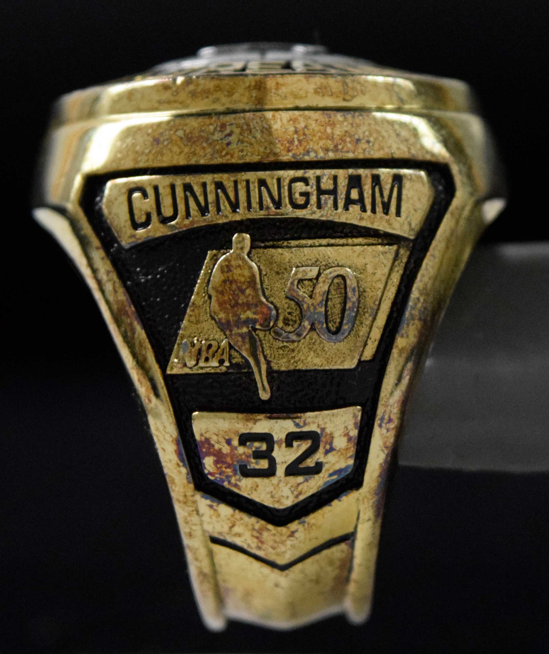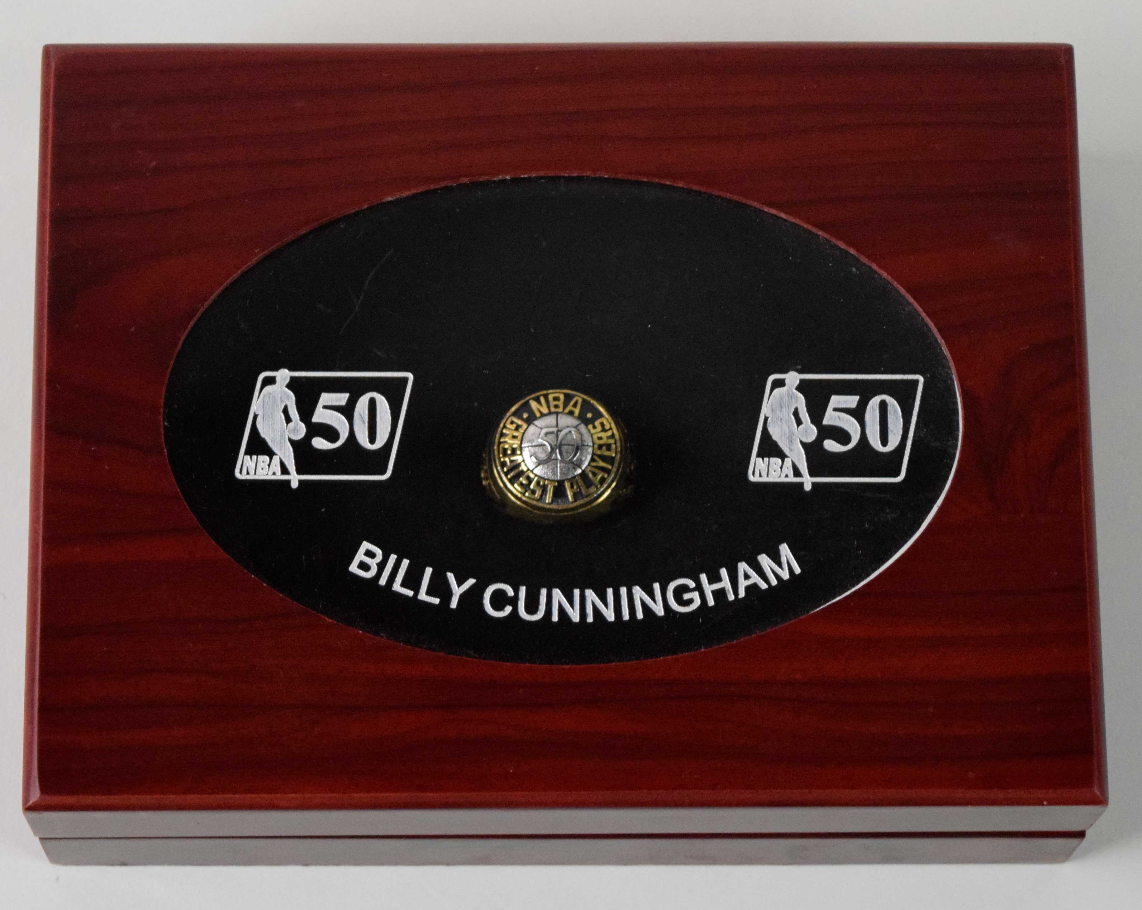 Description:Billy Cunningham NBA 50 Greatest Players Balfour sample ring (EX-NM) Replica of the ring which was presented to Cunningham for being named a member of the NBA's list of 50 greatest players. On the top face is the "50 Greatest NBA Players" crest. One shank the NBA logo with "1946 1996" years, opposite has "Cunningham" name and number "32". Marked "LGB Sample" inside. Size (13)-(13.5) with a hint of light surface tarnish and includes a presentation style box: EX-NM ($750-$1,000)