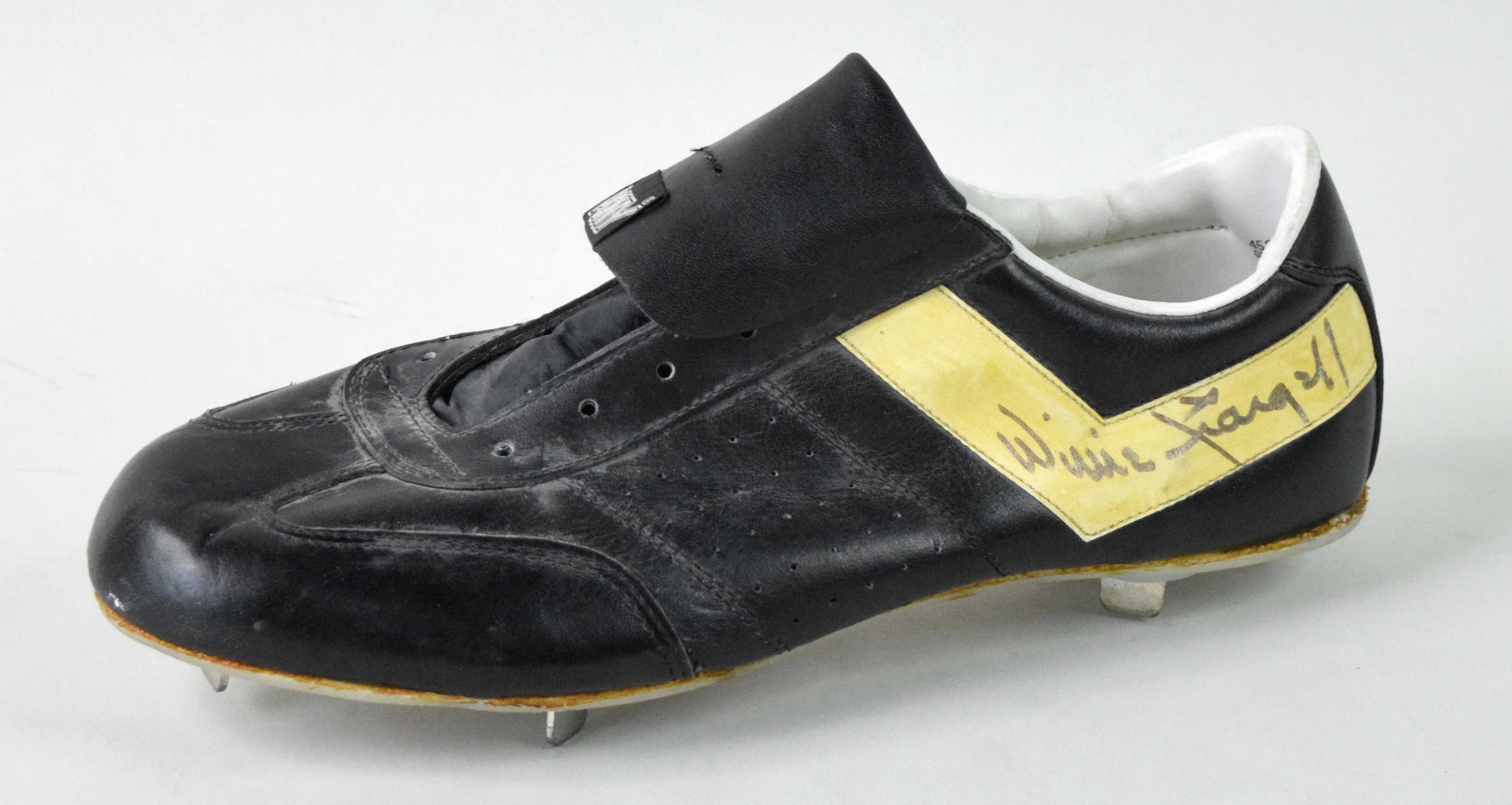 Description:Willie Stargell autographed professional model/quality cleat (EX) Pony brand cleat dating to the later portion of his career has been signed "Willie Stargell" on the outside in marker rating 7/8 out of 10. The white accent areas have been colored over in now slightly faded yellow as can be seen in images of Stargell in this period. Size (12) noted inside. Minor age/storage related wear: EX ($250-$500)
