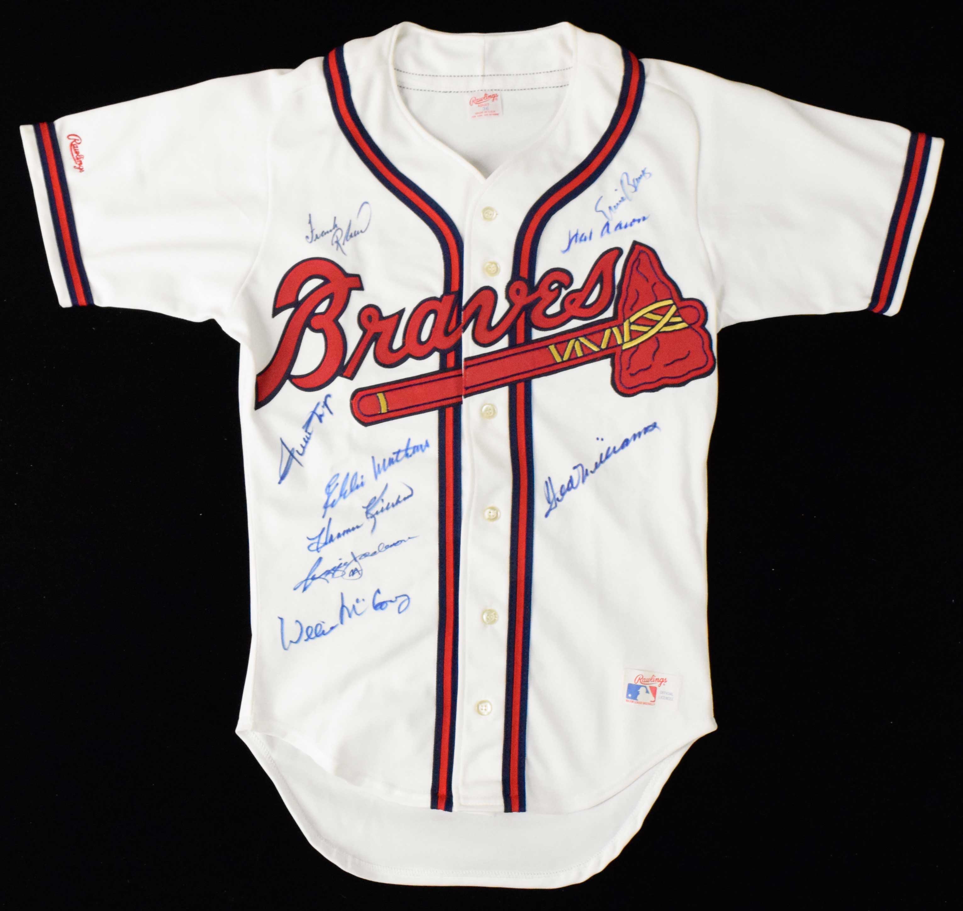 Description:500 Home Run Club autographed jersey - (9) signatures incl. Ted Williams (NM) Atlanta Braves jersey by Rawlings (size 36, blank back) has been signed by Ted Williams, Hank Aaron, Willie Mays, Ernie Banks, Frank Robinson, Eddie Mathews, Harmon Killebrew, Reggie Jackson, and Willie McCovey. Marker signatures rate 8 to 8/9 out of 10. A few minute imperfections are mentioned for accuracy and have little to no effect on display value: NM ($750-$1,000)