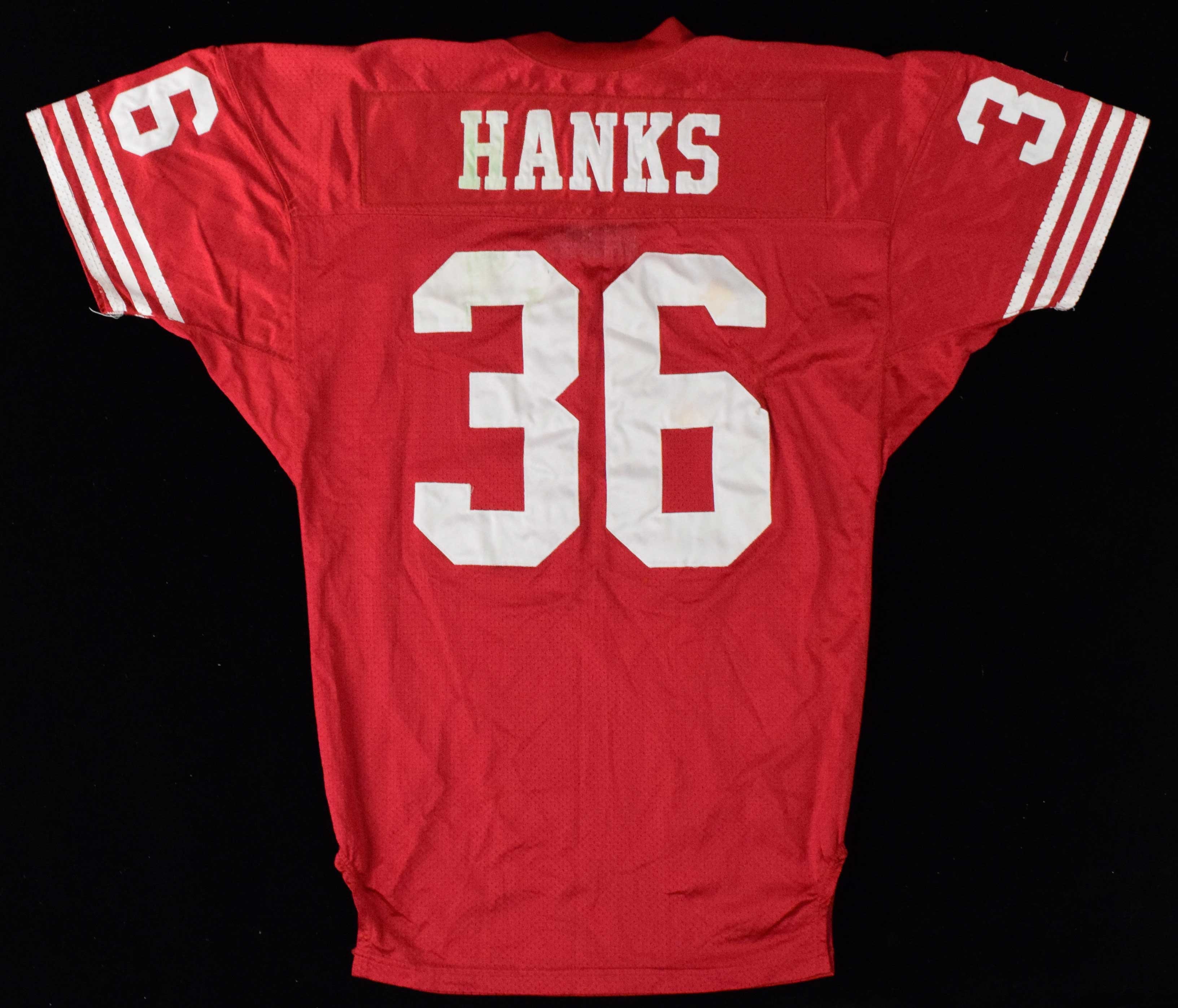 Description:January 23, 1994 Merton Hanks San Francisco 49ers NFC Championship Game professional model jersey with 49ers team letter (EX) Red mesh jersey with "Hanks" nameplate across the back has number "36" on front, back, and shoulders. "Wilson" tag on the front tail has adjacent size "44" and "FW" flag tags. Nice use and wash wear are evident throughout. Includes Cerificate of Authenticity on 49ers stationary stating that the jersey was worn on January 23, 1994 in an NFC Championship Game vs. Dallas: EX ($400-$600)