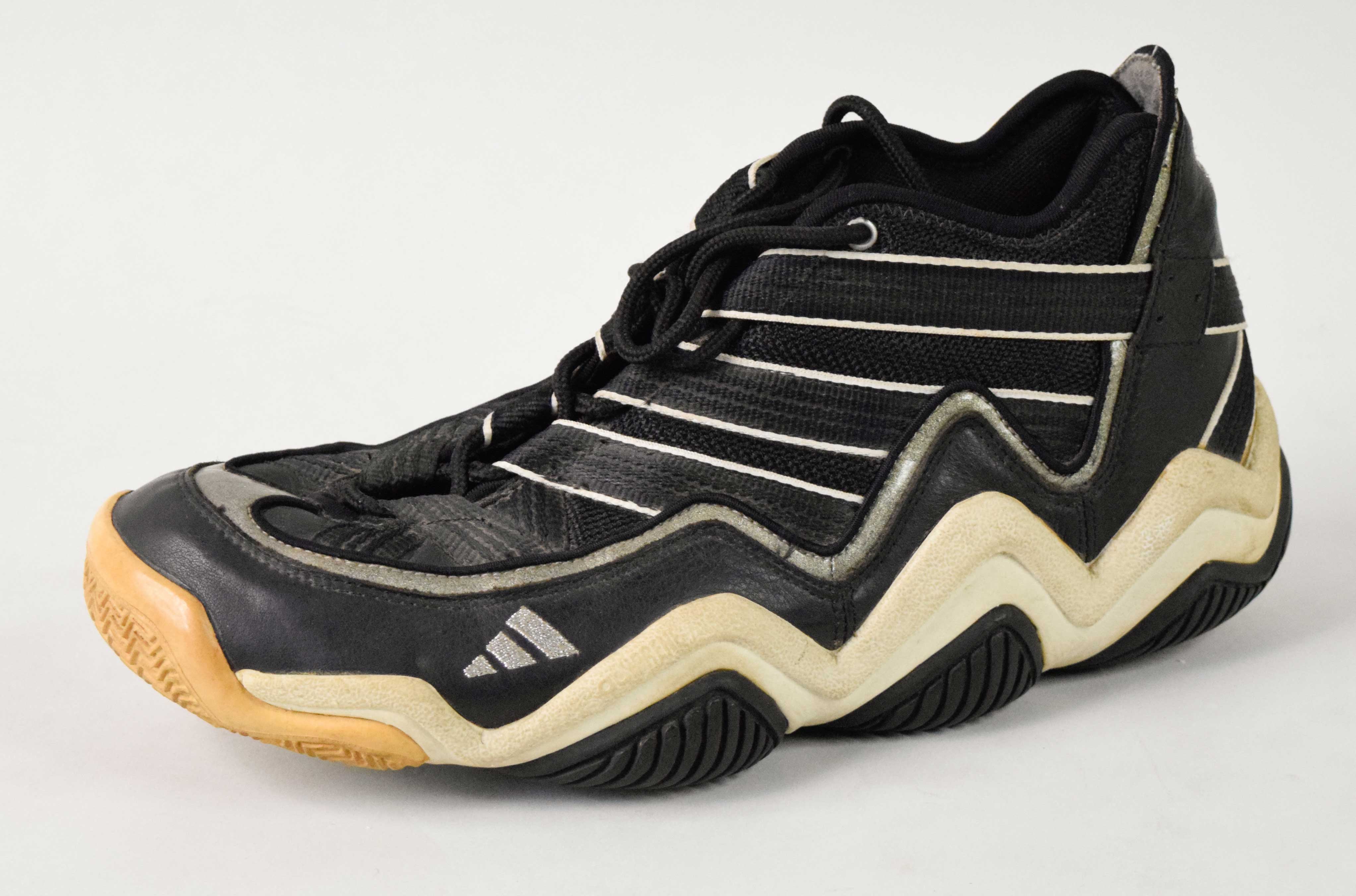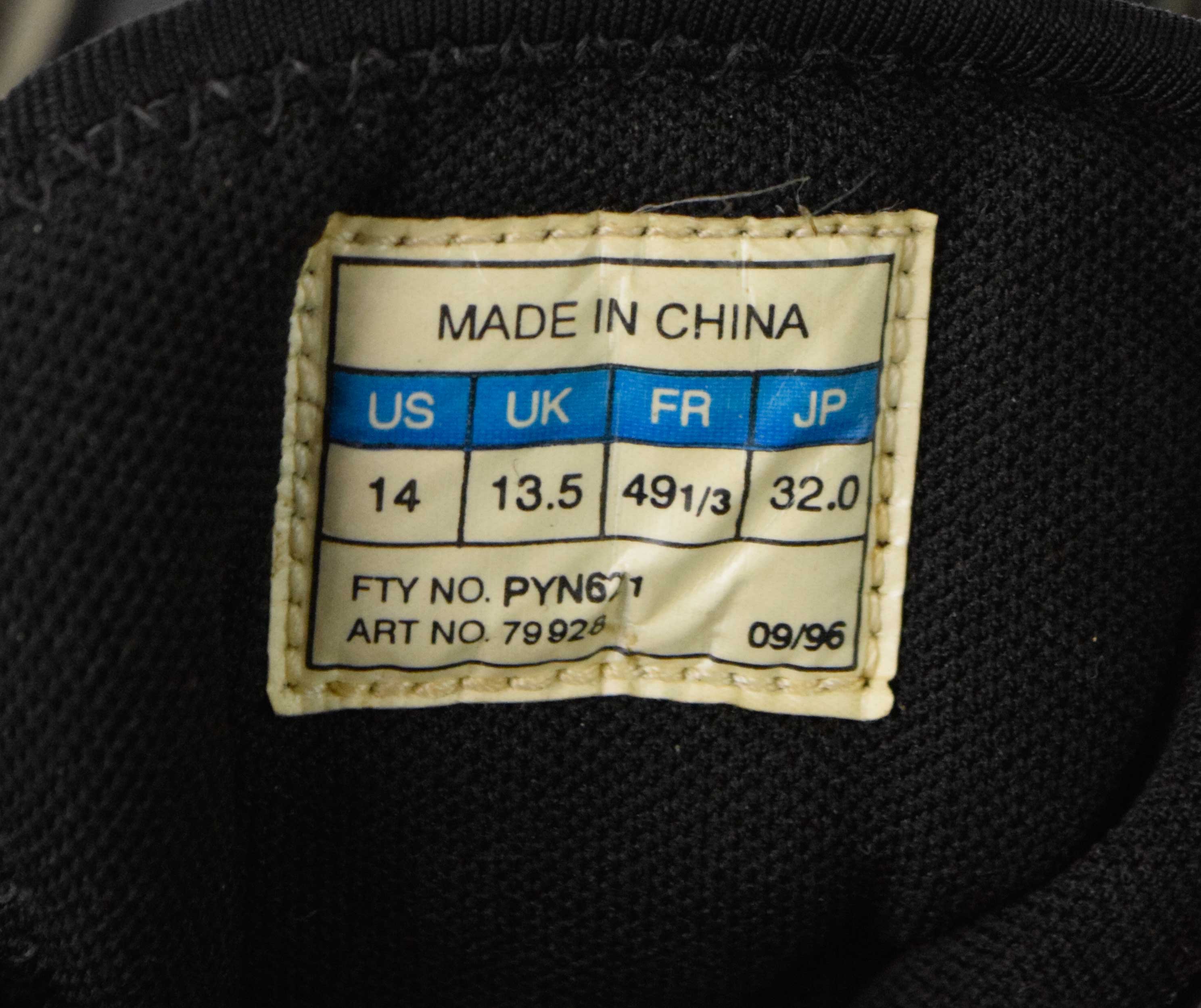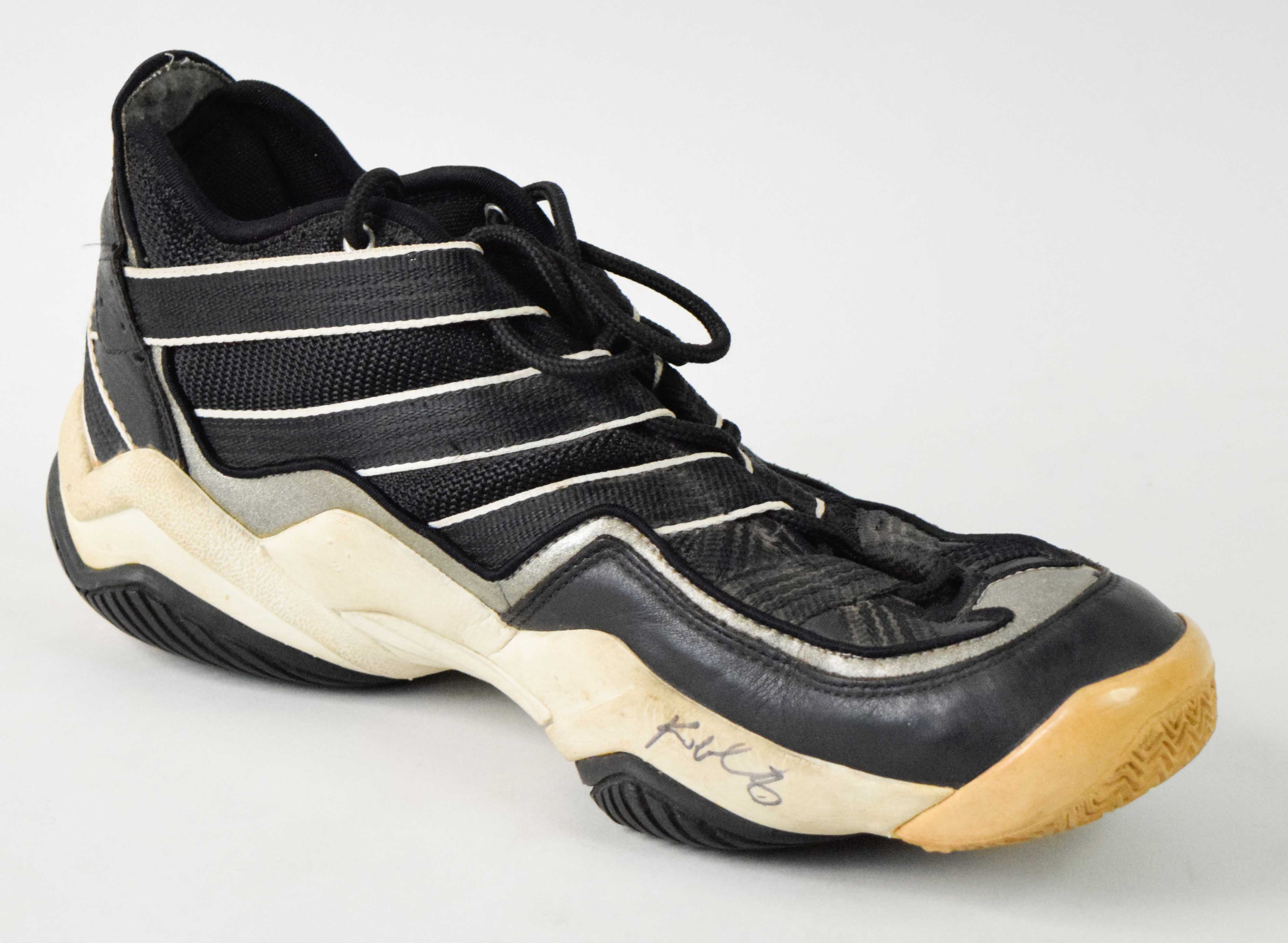 Description:1996 Kobe Bryant autographed professional model/quality sneaker (EX) Size (14) Adidas sneaker done in black with white trim. Size tag inside has 09/96 production date printed on along with the correct manufacturing codes. Signed "Kobe 8" in marker rating 8 out of 10. Strong use and some general age/storage related wear throughout. Obtained by our consignor in 1996 when the Lakers were practicing at Loyola Marymount University: EX ($5,000-$10,000)