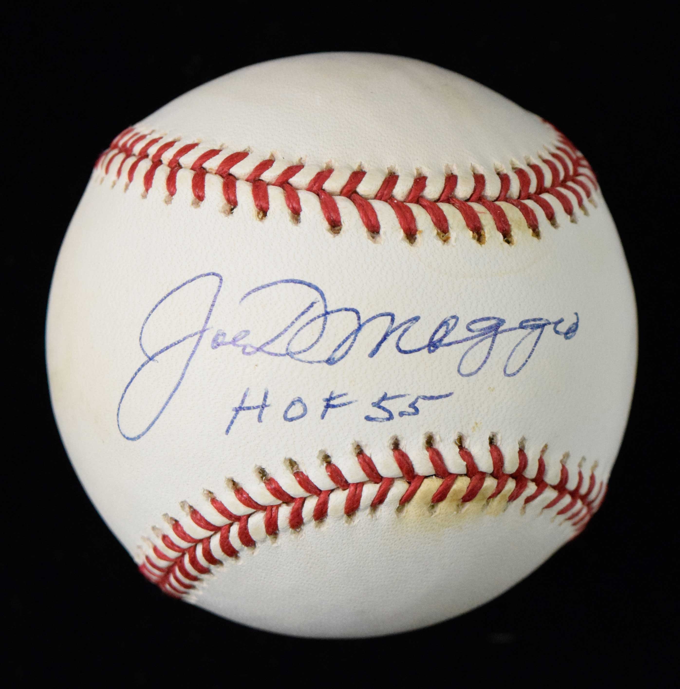 Description:Joe DiMaggio "HOF 55" single signed and inscribed baseball (PSA/DNA) (EX/MT-NM) Rawlings G.Budig OAL ball has been signed in ink rating 8/9 out of 10. There is a PSA/DNA authentication sticker affixed (1A36591) however the LOA is not included. A few minor/minute scattered imperfections are mentioned largely for accuracy: EX/MT-NM ($400-$600)