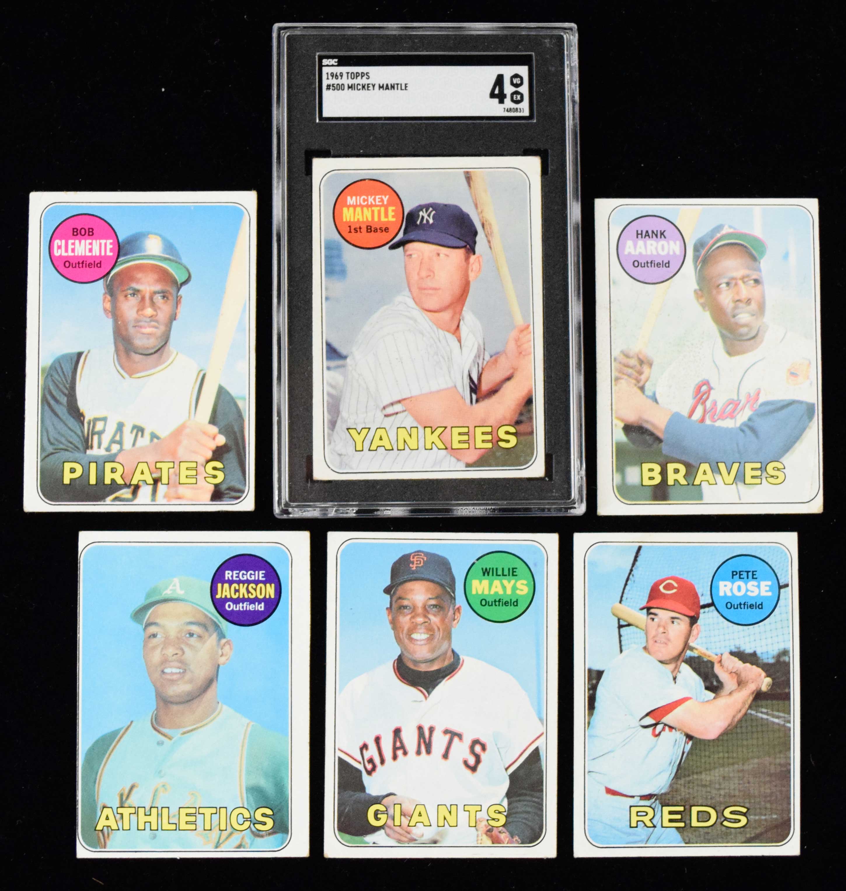 1969 Topps Baseball complete set (664 cards) (Avg. VG) Keys: #20 Banks (GD/VG), 50 Clemente (GD), 85 Brock (VG), 95 Bench (VG/EX OC), 100 Aaron (GD), 120 Rose (VG/EX-EX), 130 Yastrzemski (VG), 190 Mays (VG), 260 Jackson (miscut), 480 Seaver (GD/VG), 500 Mantle (SGC 4 VG EX), 510 Carew (GD), 533 Ryan (GD), and 587 Fingers (VG/EX wax on front). Average VG condition throughout with GD-EX general range: Avg. VG ($1,000-$2,000)