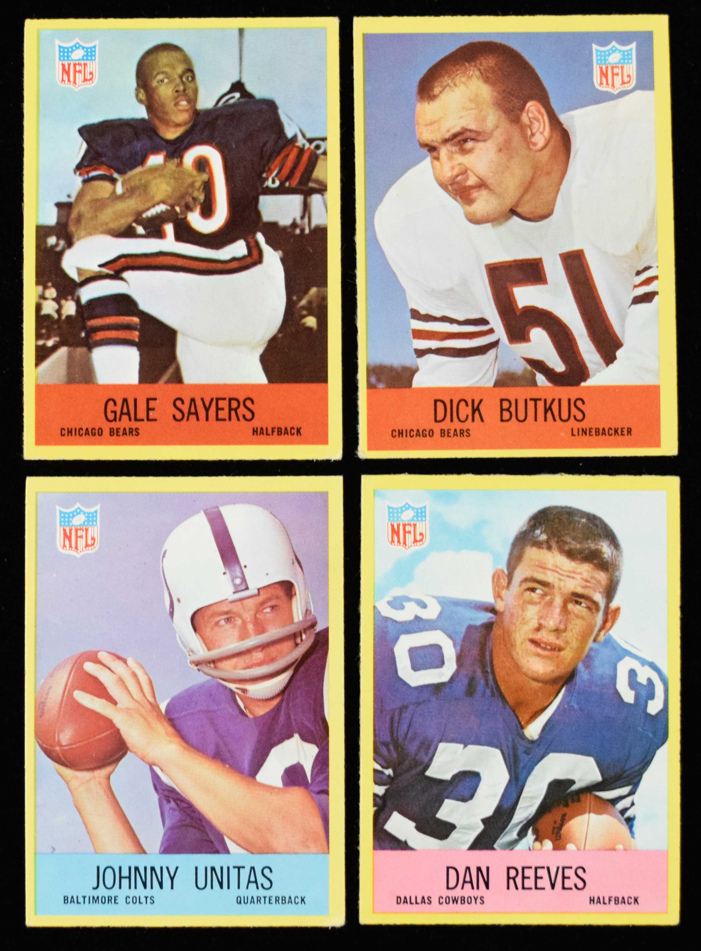 1967 Philadelphia Football complete set (198 cards) (Avg. VG/EX) Keys: #23 Unitas (VG), 28 Butkus (VG), 29 Ditka (VG), 35 Sayers (GD/VG), 43 Kelly (VG), 58 Reeves (EX-EX/MT), 80 Robinson (EX), 82 Starr (VG/EX), 123 Hornung (EX/MT OC), 165 Smith (EX), 178 Wilcox (VG), and 183 Hanburger (EX). Checklist #2 has ink marks. Average VG/EX condition throughout: Avg. VG/EX ($400-$600)