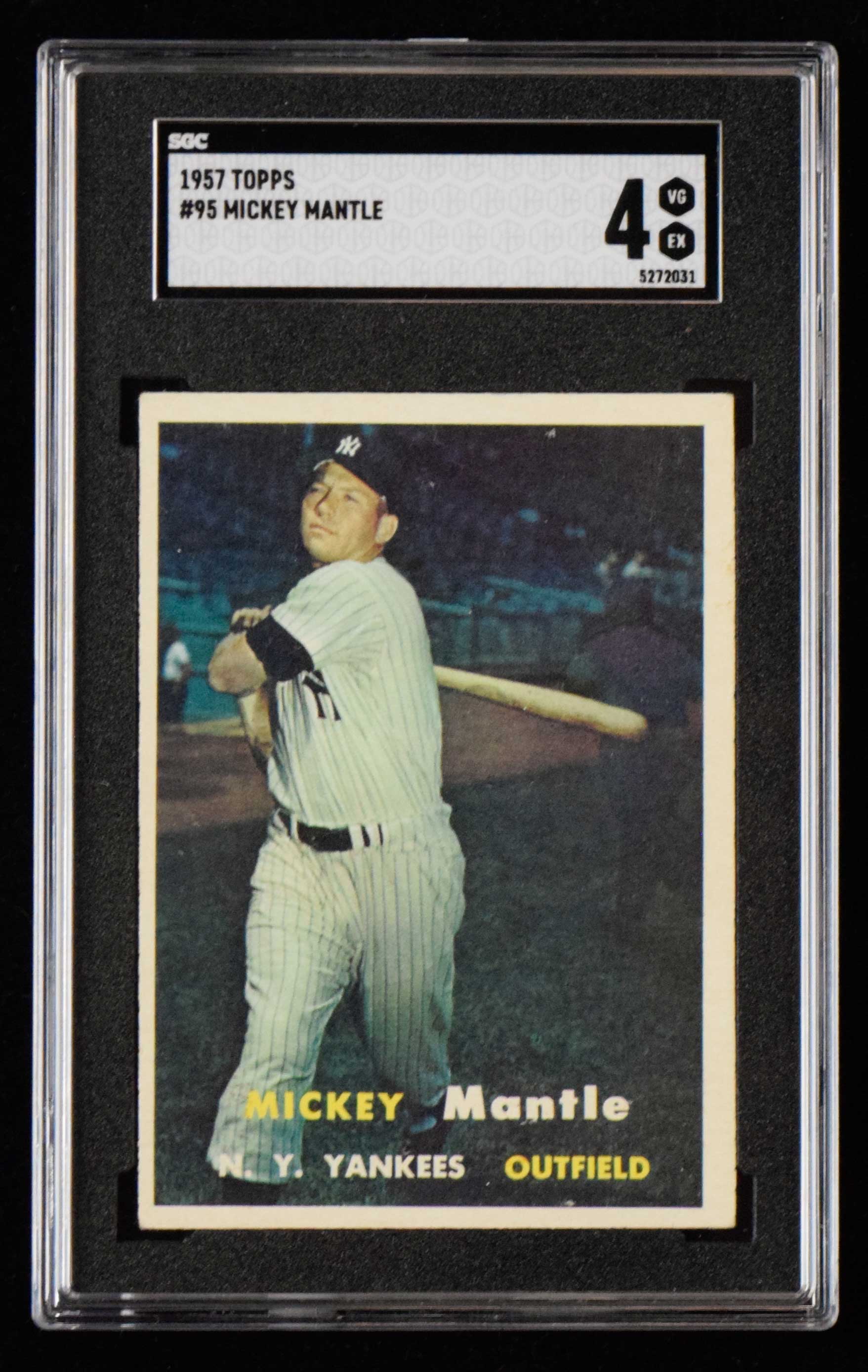 Description:1957 Topps #95 Mickey Mantle (SGC 4 VG EX) Crisp registration to image which sits off center on card with just a touch of corner wear: SGC 4 VG EX ($750-$1,250)