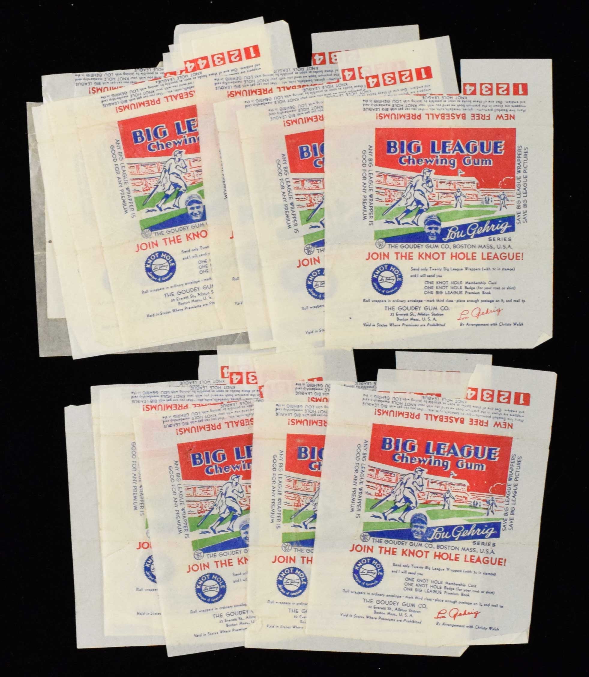 Description:Lot of (17) 1934 Goudey wrappers (see description) Sizable number of original wrappers with colorful graphics/text and a portrait of Lou Gehrig. Each has has the upper left corner cut off and there are varying degrees/types of moderate to heavy wear throughout all: see description ($500-$750)