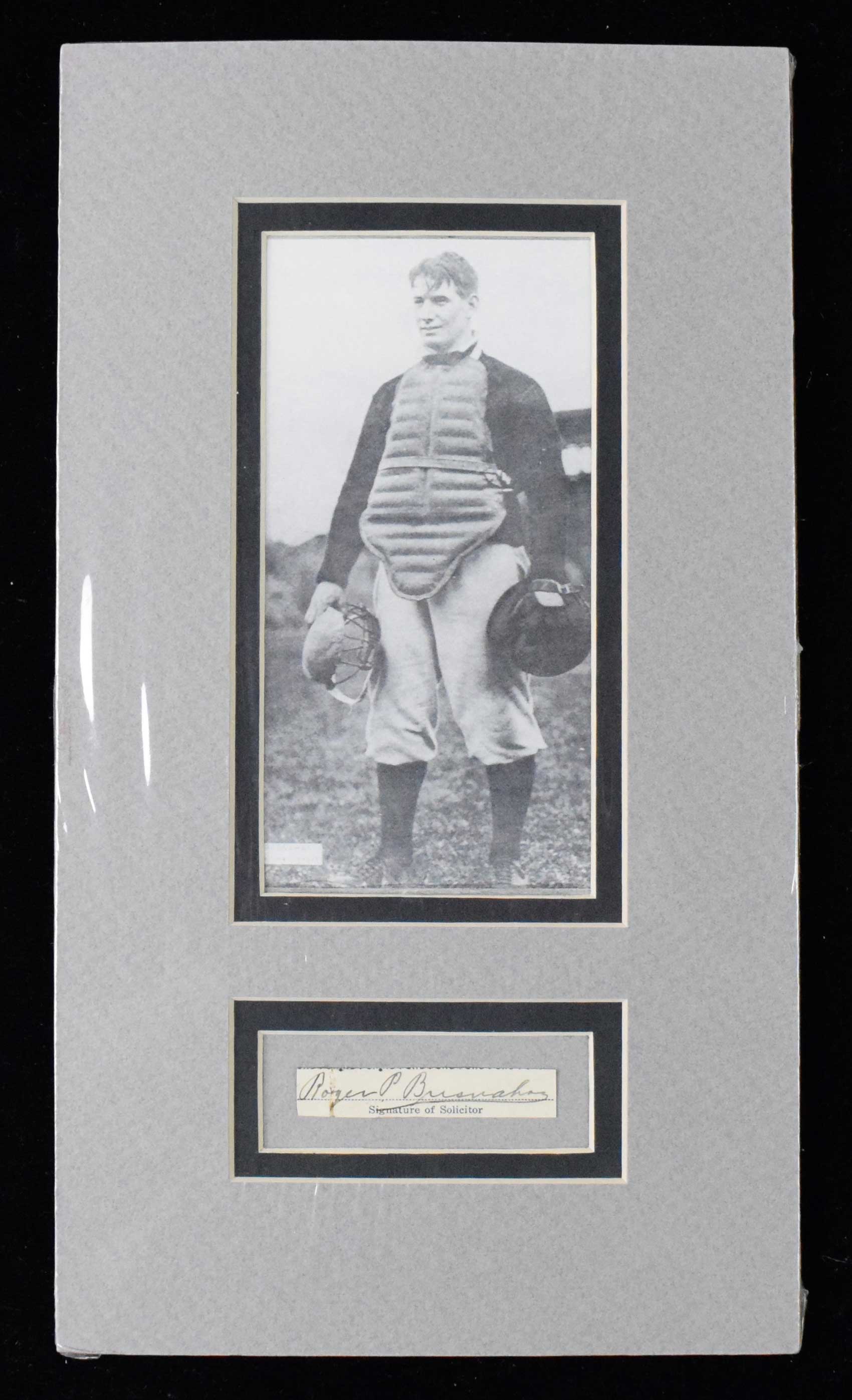 Description:Roger Bresnahan autograph (EX-NM) Diminutive "Roger P Bresnahan" signature rating 8 out of 10 appears on .5"x2.25" slip of paper which was clipped from a larger document. Matted to 6.25"x11" for display: EX-NM ($300-$500)