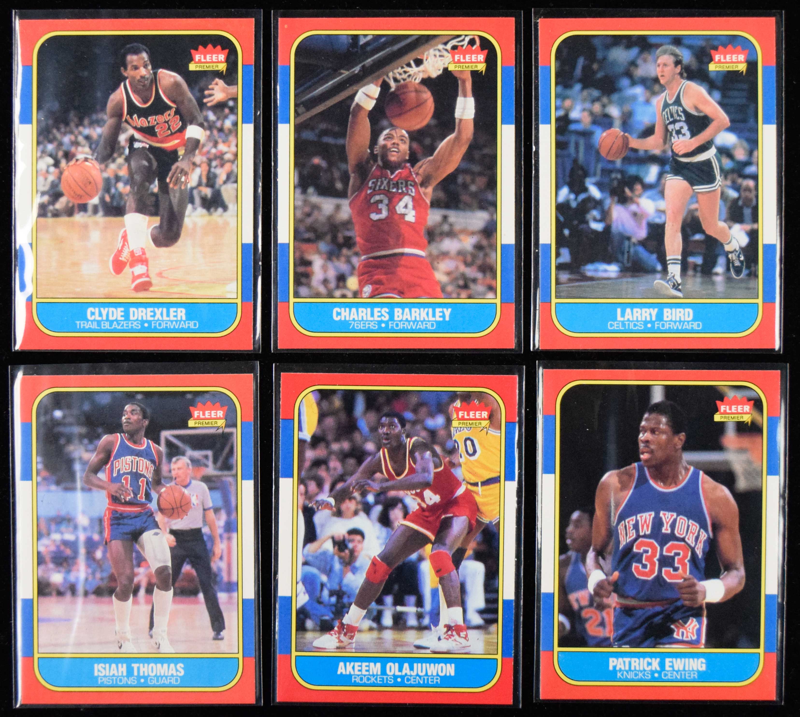 Description:High grade 1986-87 Fleer Basketball near complete set (131 of 132 cards) Keys: #1 Jabbar (EX/MT), 7 Barkley (NM very slightly OC), 9 Bird (NM), 12 Bol (NM OC), 26 Drexler (NM), 27 Dumars (NM), 32 Ewing (NM), 53 Johnson (NM OC), 68 Malone (minute fraying to one upper back corner), 77 Mullin (EX/MT-NM), 82 Olajuwon (NM), 109 Thomas (NM/MT), 121 Wilkins (NM OC), 131 Worthy (NM OC), and 132 Checklist (NM OC). Balance are in average NM condition with just a few lesser: Avg. NM ($1,000-$2,000)