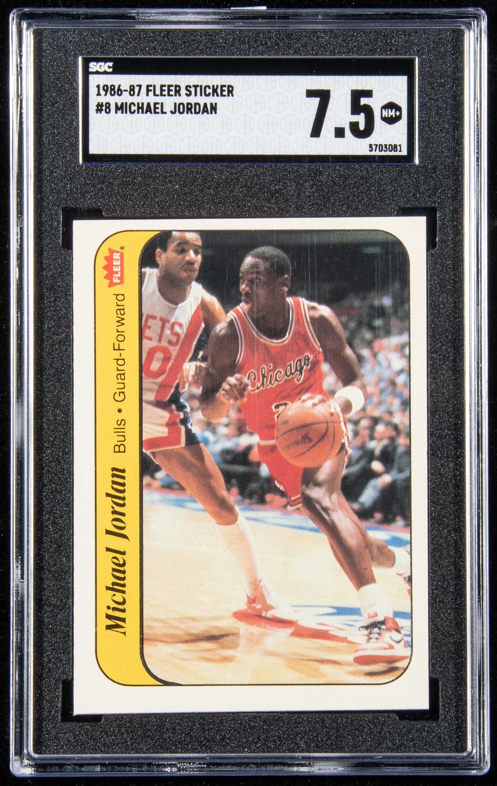 Description:1986 Fleer Sticker #8 Michael Jordan (SGC 7.5 NM+) Rookie year issue in "pack fresh" condition with razor sharp corners and edges and centering which accounts for technical downgrade: SGC 7.5 NM+ ($1,000-$2,000)