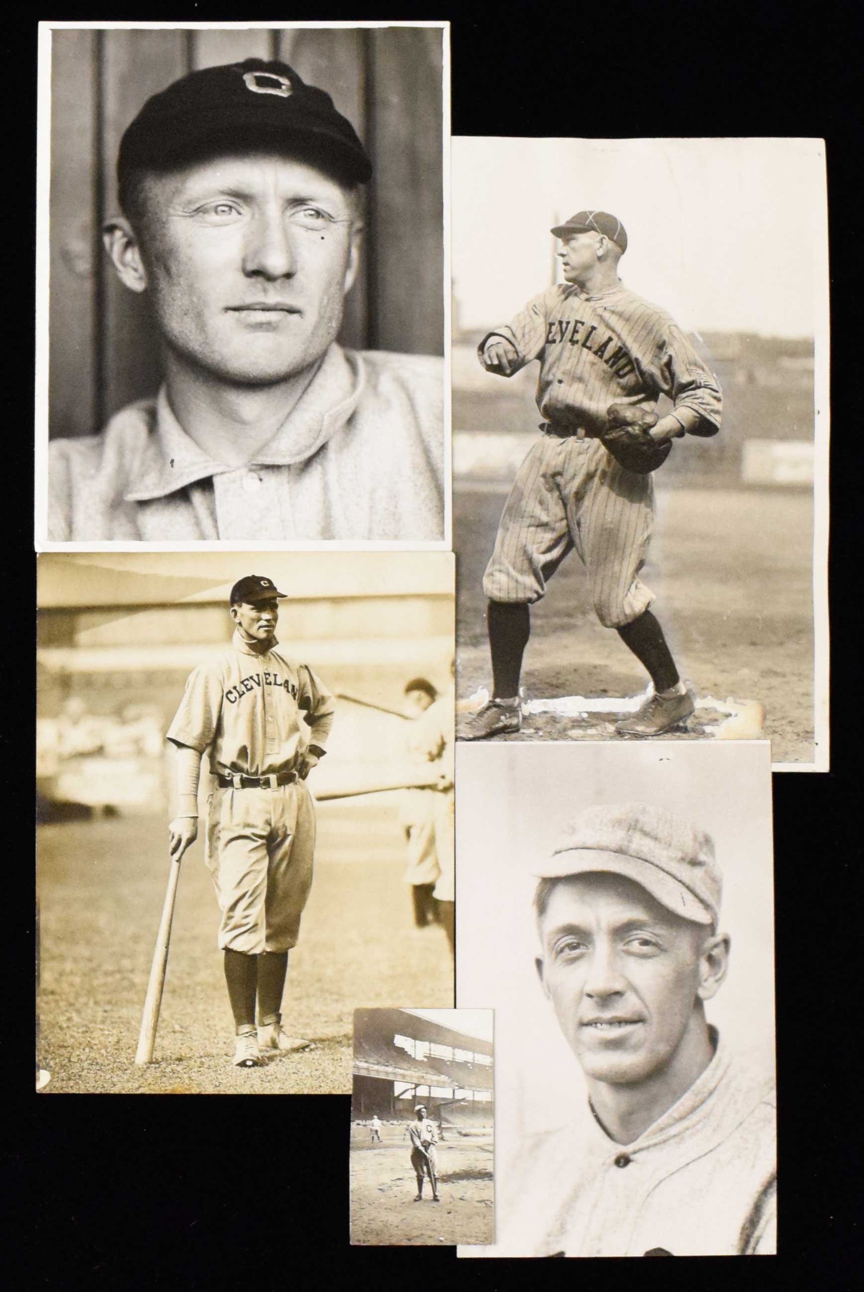 Description:Lot of (17) c.1910s-30s Cleveland Indians photos incl. t205 image and (2) by Conlon (GD-EX) Includes 5"x8" photo "Conlon" stamp on the back along with his handwritten "Caldwell" identifier; 8"x10" photo which has "Conlon" last name signature on the back along with "Harris Cleveland" handwritten identifier; 6.5"x8.5" photo of Terry Turner which is Paul Thompson image that was used for his T205 card. This photo does not have a Thompson stamp (there is a "Baseball Magazine" hologram) and while it is likely to be a period original we can not gurantee that it is; photos (varying sizes) identified as showing Bruce Caldwell, Luke Sewell, and George Stovall; and (11) c.1910s-30s small (snapshot and slightly larger size) images of largely unidentified Indians players. Varying degrees/types of wear throughout: GD-EX