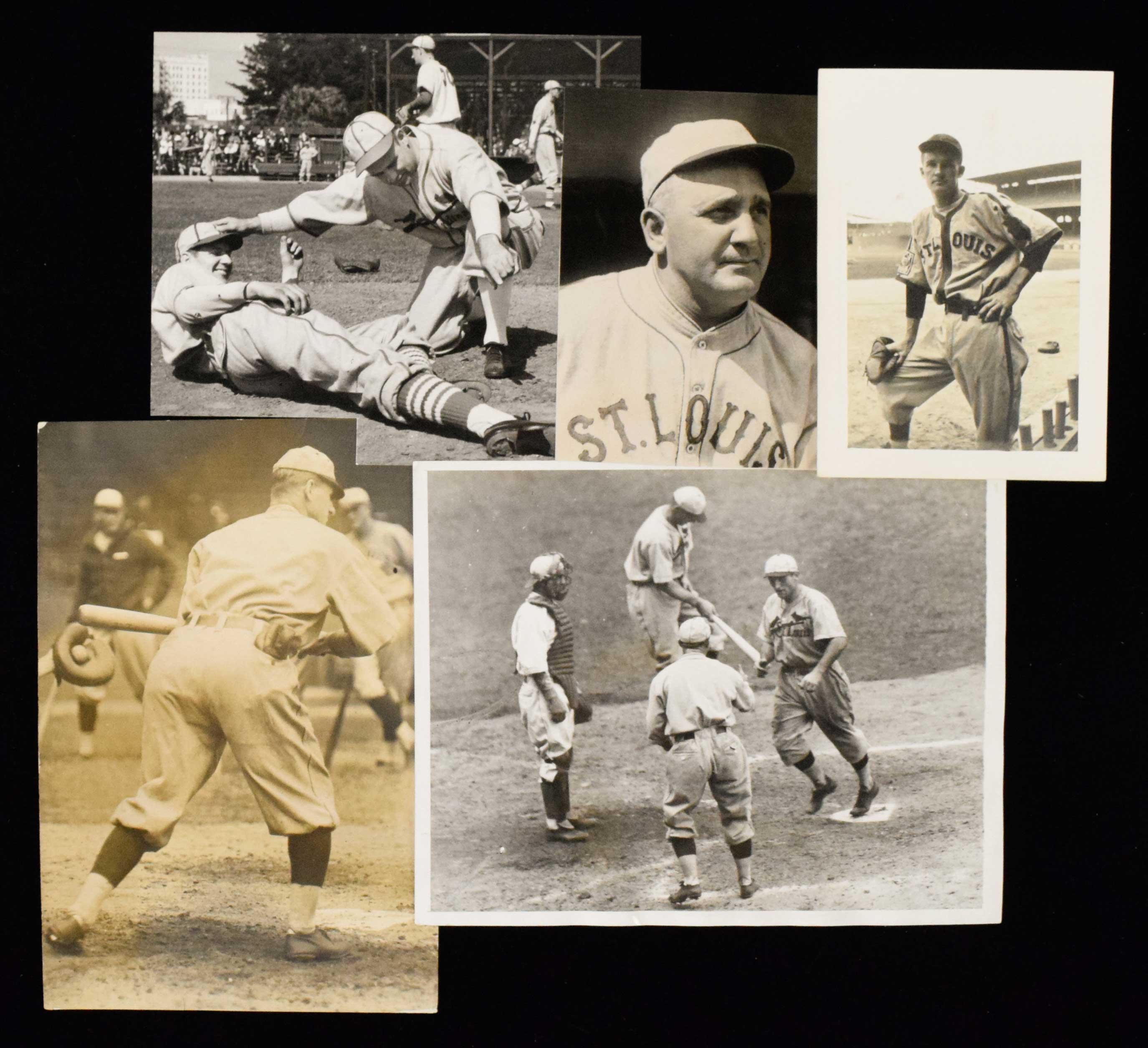 Description:Lot of (20) c.1910s-40s St. Louis Browns and Cardinals player photographs (GD-EX) Subjects are identified as including George Baumgardner, Jack Powell, Sam Hale, Sam West, Bump Hadley, George Sisler (in small candid photo with other players in street clothes), Lin Storti, Lee Fohl, George McQuinn, Ken Williams, Jimmy Austin, Joe Bush, Bill DeLancy (2), Ray Blades/Marty Marion, Lon Warneke (2), Pepper Martin, and a rain delay scene from Sportsmans Park. Some pieces have date stamps and/or other markings. Varying degrees/types of wear throughout. Sizes range from around snapshot size to 8"x10": GD-VG