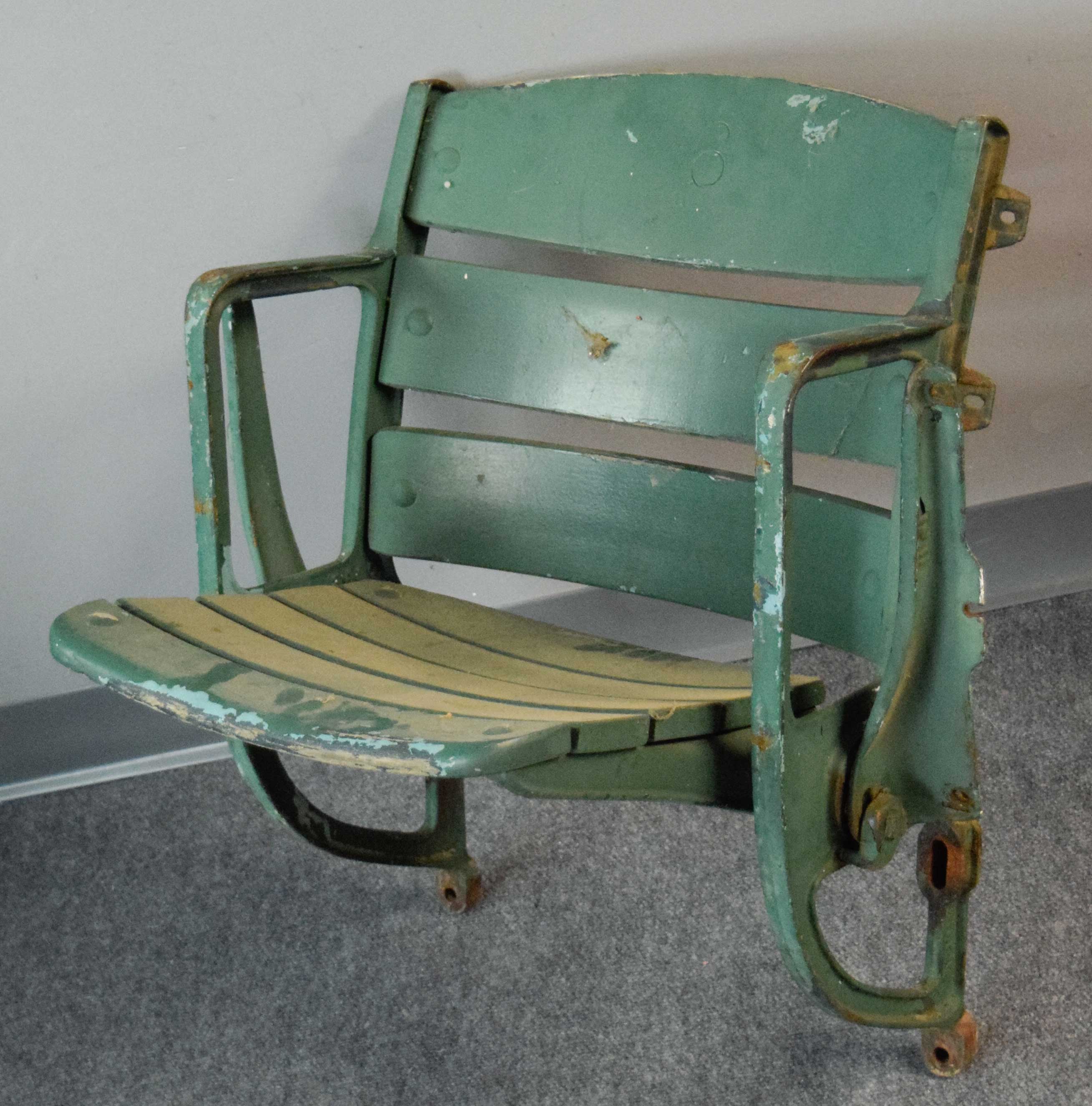 Description:Milwaukee County Stadium seat (EX) Cast iron and wood curved back seat remains fully functional with wear throughout consistent with long term outdoor use: EX