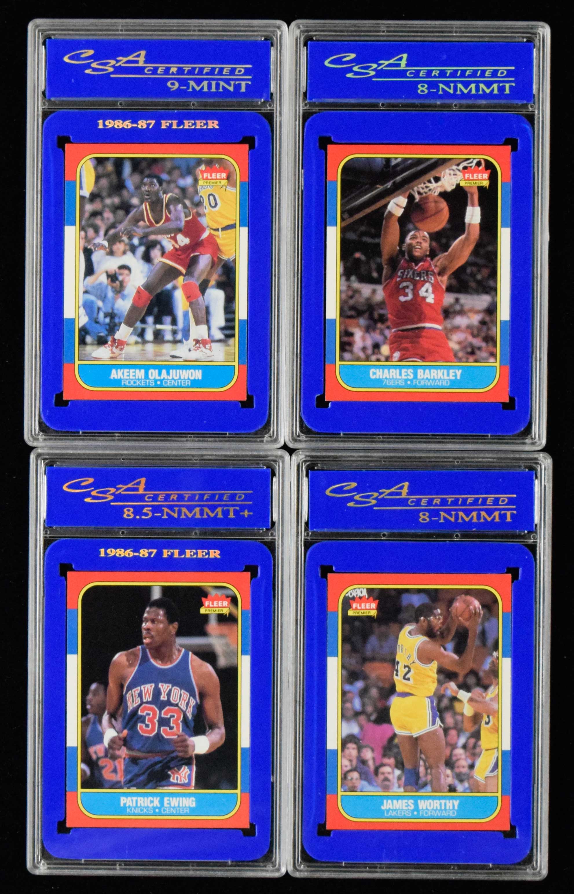Lot of (4) "CSA" graded 1986-87 Fleer Basketball Hall of Famer Rookie cards ("8 NMMT" to "9 Mint") Includes CSA "9 Mint" #82 Olajuwon; CSA "8.5 NMMT+" #32 Ewing; and CSA "8 NMMT" #7 Barkley and 131 Worthy: "8 NMMT" to "9 Mint"