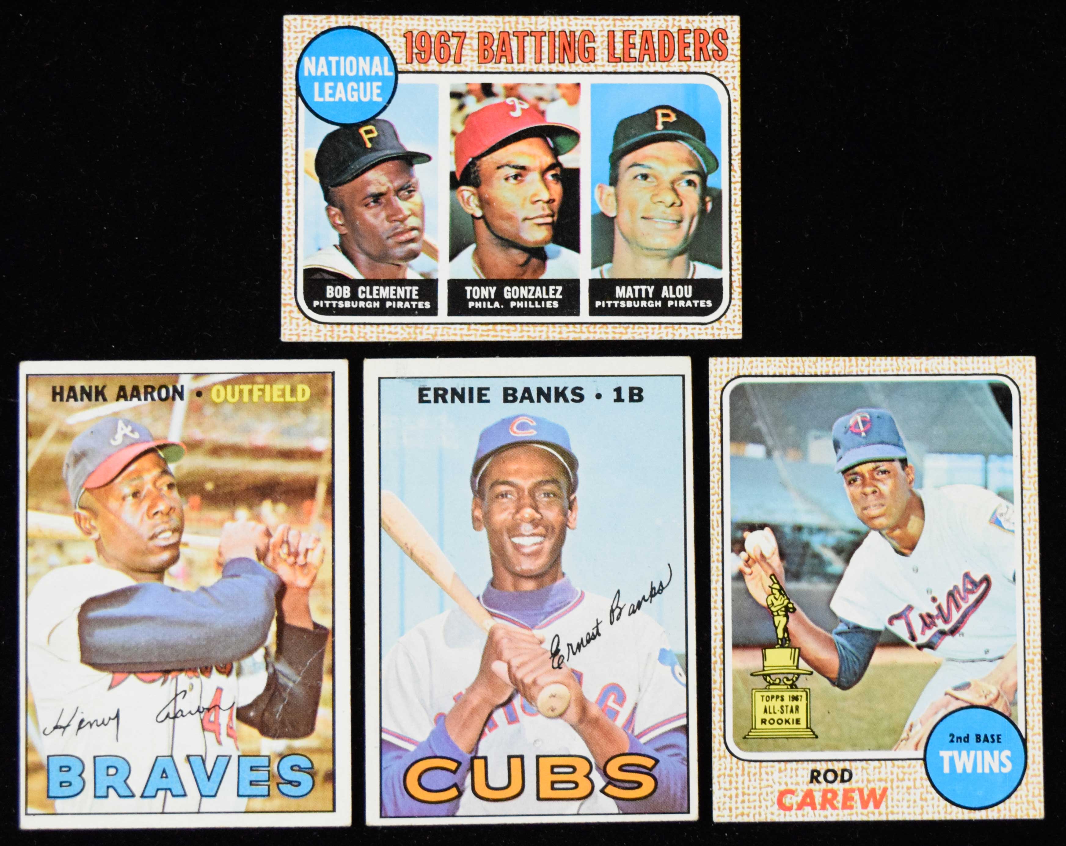 Lot of (9) 1967-68 Topps Baseball Hall of Famers (Avg. VG/EX) Includes 1967 Topps #210 Gibson, 215 Banks, 234 Leaders, 250 Aaron, and 285 Brock; 1968 Topps #1 Leaders, 80 Carew, 103 Sutton, and 408 Carlton. Average VG/EX condition: Avg. VG/EX