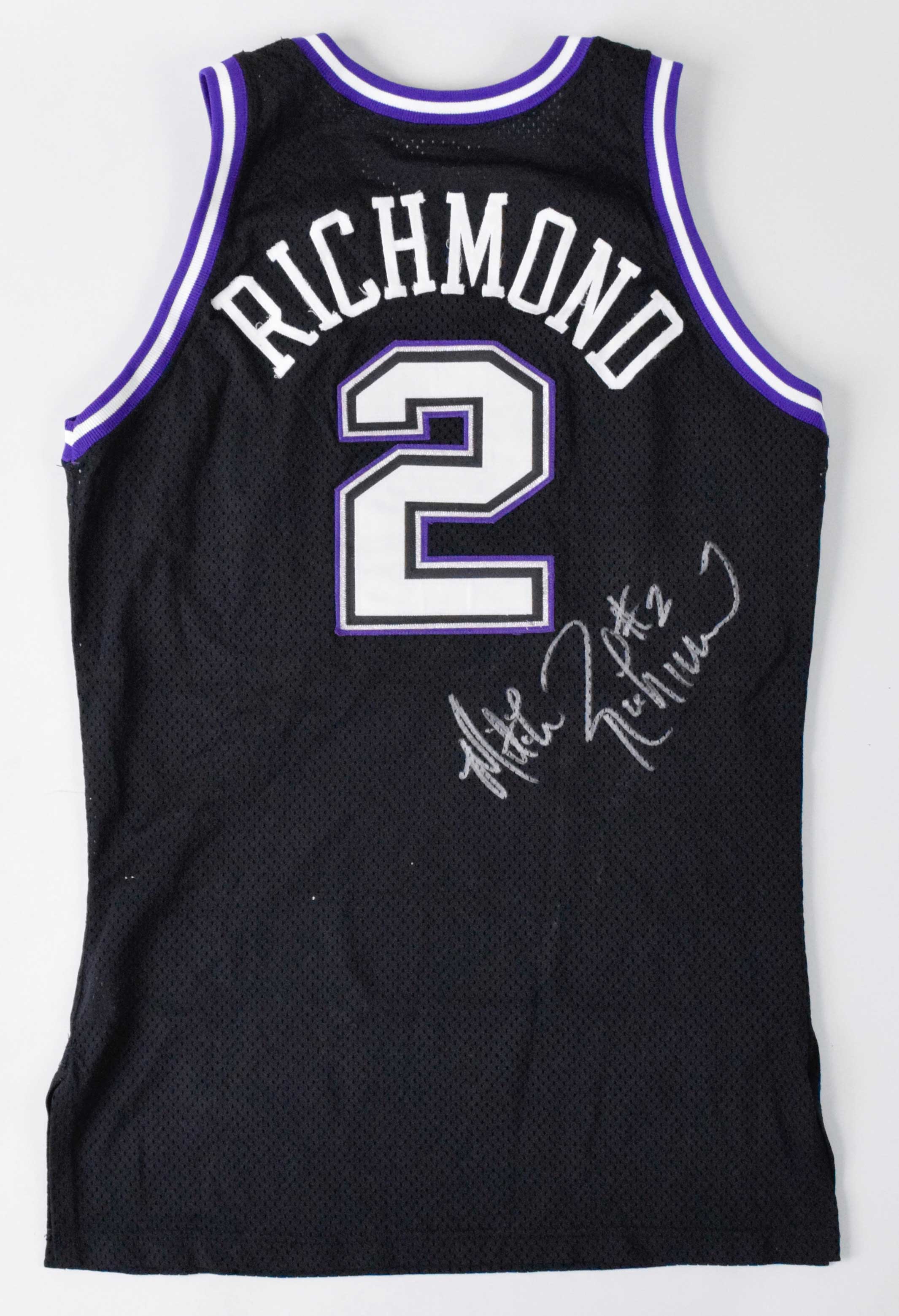 Description:1994-95 Mitch Richmond autographed Sacramento Kings professional quality jersey (EX-NM) Black mesh jersey has "Kings 2" on the front and "Richmond 2" on back. Champion tag on the front tail notes size (42) and is beside a "Designed & Tailored Exclusively…" 1995-95 year tag with "Body Length +4" custom hem notated in block letter. Signed on the back in marker rating 8/9 out of 10. Touch of light possibly use/wash wear: EX-NM