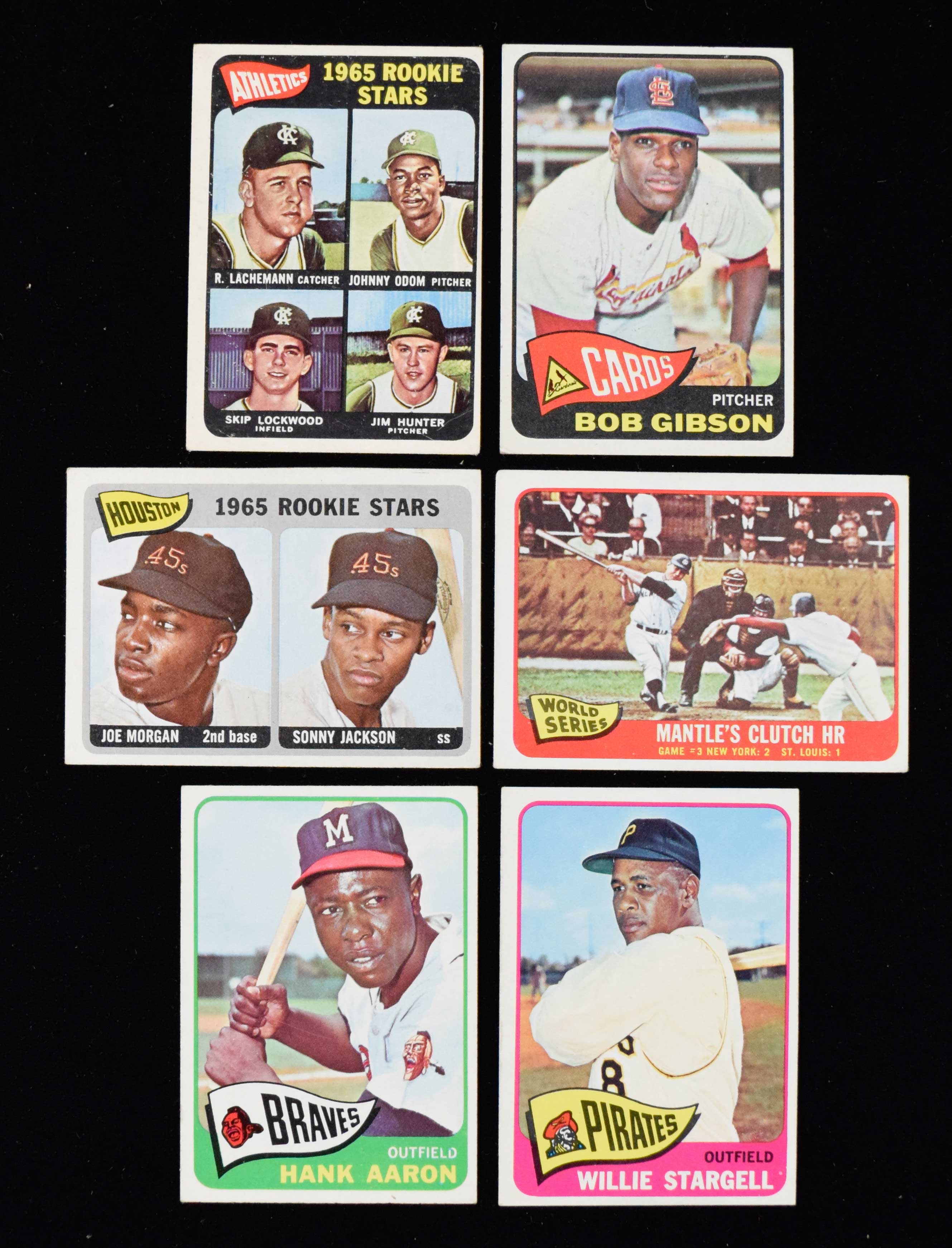 1965 Topps partial set (approx. 475 of 600 cards) including numerous Hall of Famers (GD-EX) Average VG condition with GD-EX general range. Key cards (average VG-VG/EX condition) include #4 Leaders, 5 Leaders, 6 Leaders, 8 Leaders, 16 Morgan, 50 Marichal, 120 Robinson, 134 Mantle HR, 150 Robinson, 176 McCovey, 193 Perry, 170 Aaron, 260 Drysdale, 282 Murakami, 320 Gibson, 330 Ford, 360 Cepeda, 377 Stargell, 400 Killebrew, 461 Niekro, 470 Berra, 500 Mathews, 513 Yankees, 526 Hunter (GD), and 540 Brock: GD-EX ($400-$600)