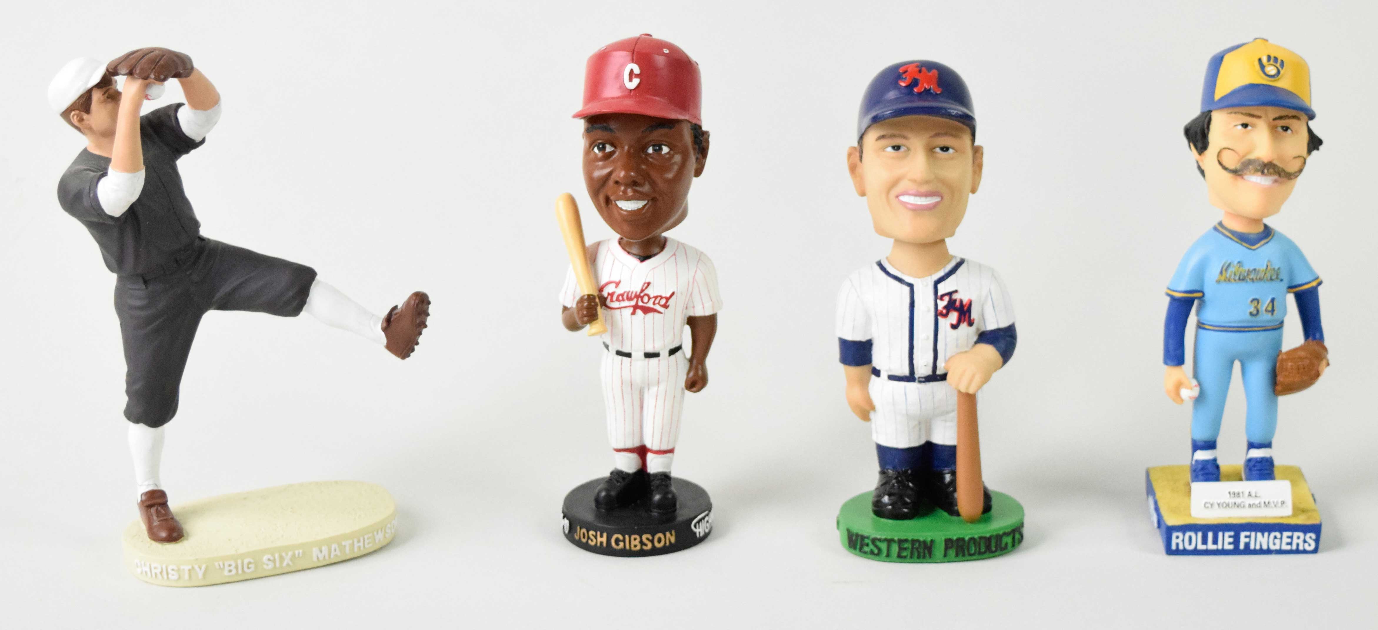 Description:Lot (10) assorted MLB BobbleHeads - mostly HOFers (EX/NM-NM) Includes Rollie Fingers, Roger Maris, Cal Ripken, (2) Paul Molitor (one is Brewers, the other Twins), Alex Rodriguez, Satchel Paige, and Josh Gibson are all Bobbleheads while there is a smaller Ozzie Smith Figure and a Hartland Limited Edition Christy "Big Six" Mathewson #'d 90/200. All are out of their original boxes but present very well still, not much wear to speak of outside of A-Rod's bat being broken : EX/NM-NM
