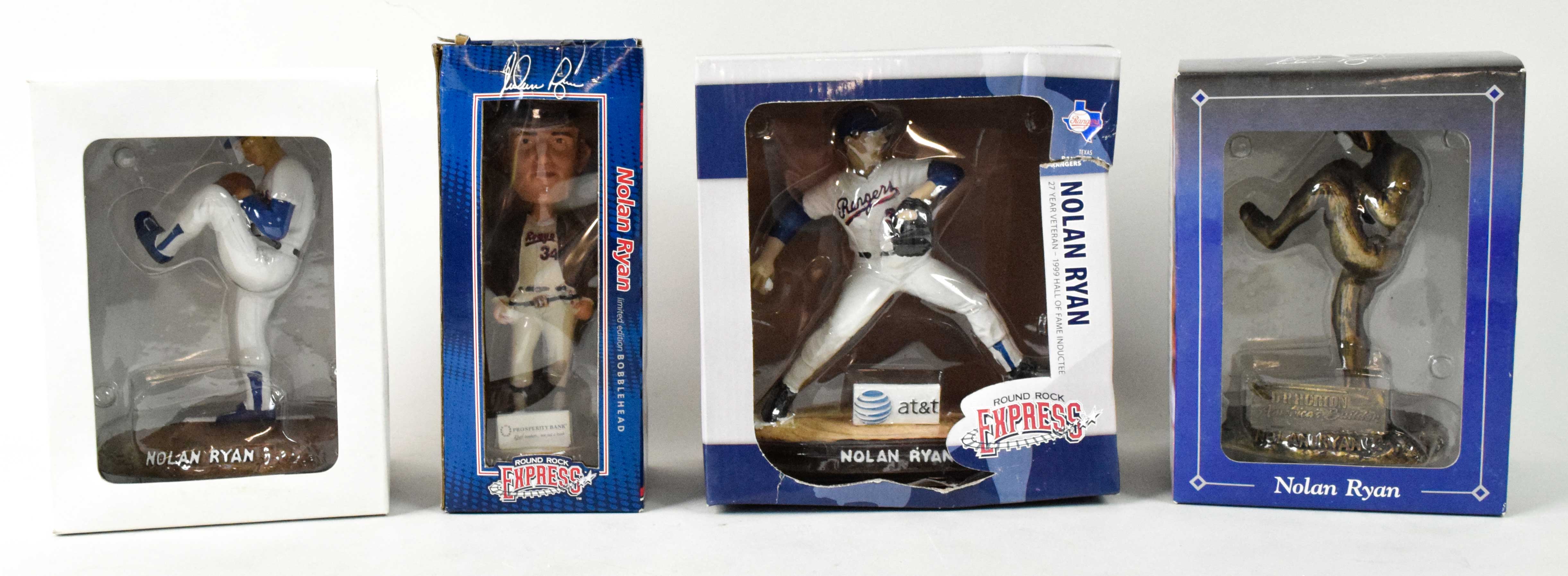 Description:Lot (8) Nolan Ryan Bobbleheads and Figures (NM) Includes 2001 Nolan Ryan SGA Bobble Head Dr. Pepper 7-Eleven Texas Rangers (with ticket from game taped to the box), (2) Round Rock Express 27 year veteran Figures, Round Rock Express Nolan Ryan Statue from game in June 2005 (Ticket included), (3) Nolan Ryan Bobblehead Limited Edition Round Rock Express Duster & Cowboy Hat, and a Nolan Ryan D-R-Horton Americas Builder Hartland statue. All but the Dr. Pepper bobble are in their original box and present vell well: NM