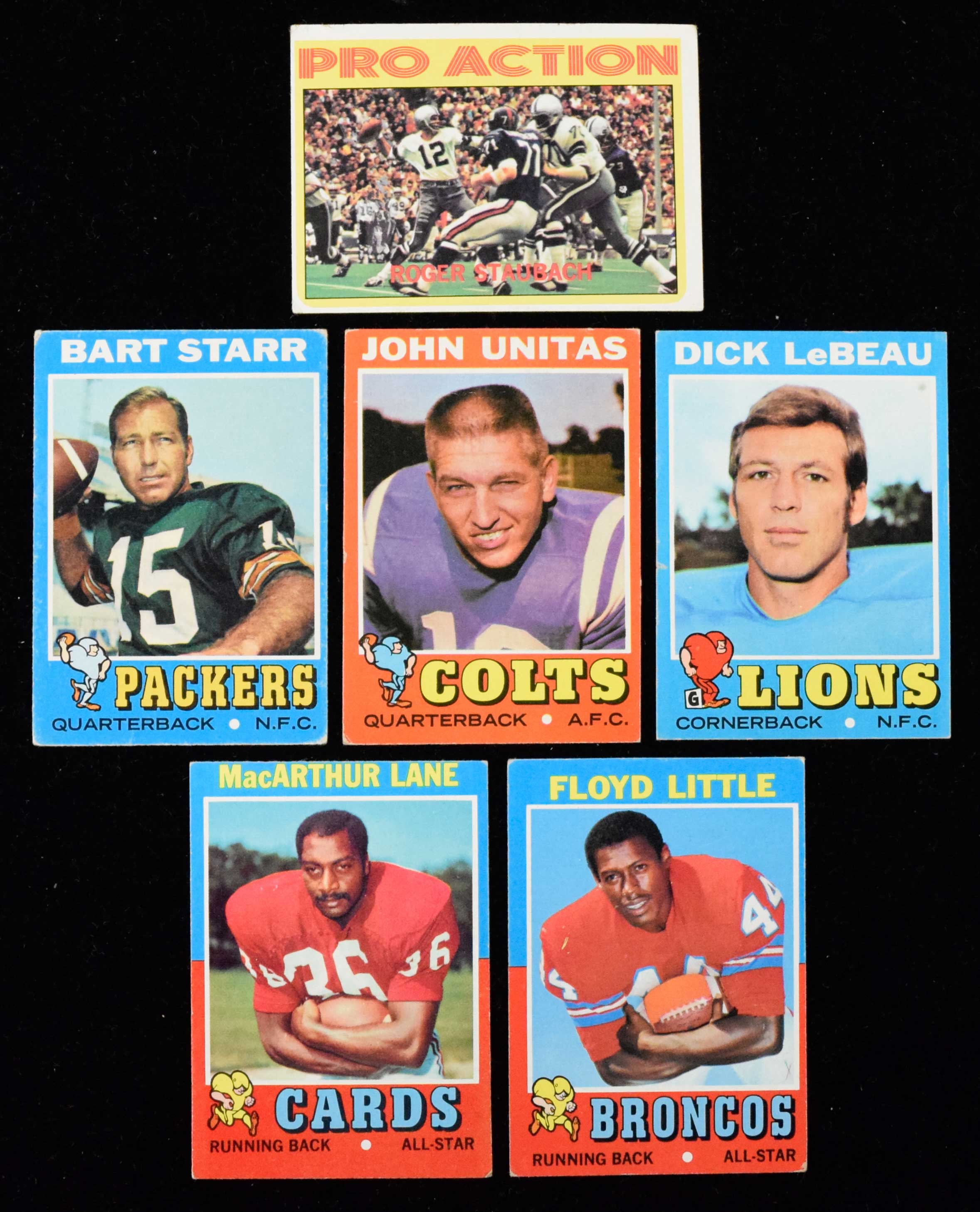 Description:Lot (137) 1971 Topps NFL and (8) 1972 Topps NFL cards PR/FR-NM Includes from 1971 #1 Unitas (FR), #110 Little (PR-FR), #135 Lane (FR) #154 LeBeau (FR), #200 Starr (PR-FR) and 1972 #122 Staubach (PR-FR) Varrying conditions throughout the lot. Most appear to average VG/EX-EX overall. Range: PR/FR-NM