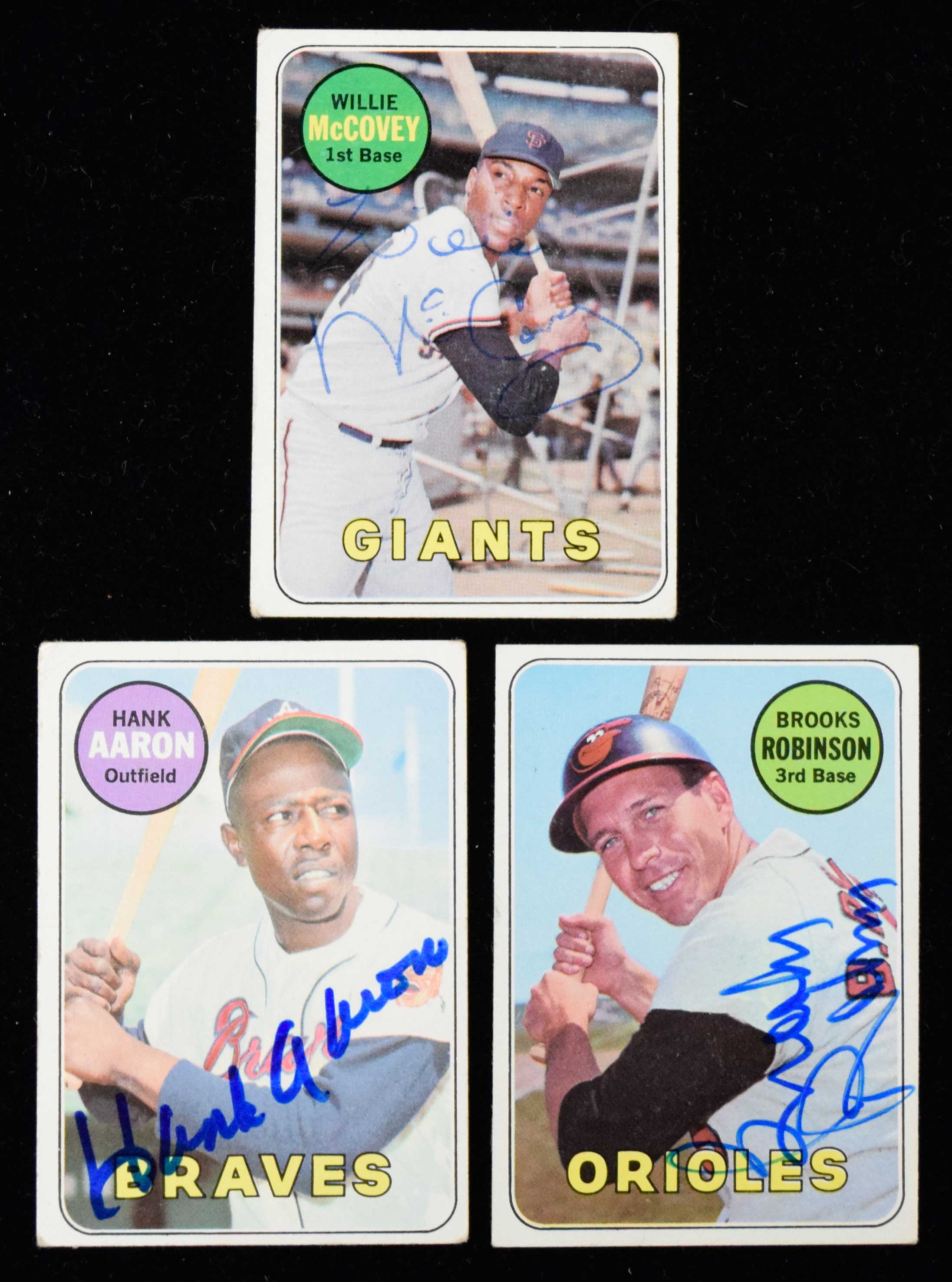 Description:Signed 1969 Topps Hank Aaron, Willie McCovey, and Brooks Robinson cards (PR-FR/GD) Includes #100 Hank Aaron (PR-FR), #440 Willie McCovey (PR-FR), and #550 Brooks Robinson (FR/GD). All signed in blue ink, signatures rate 6 (McCovey) to 9 out of 10: PR-FR/GD