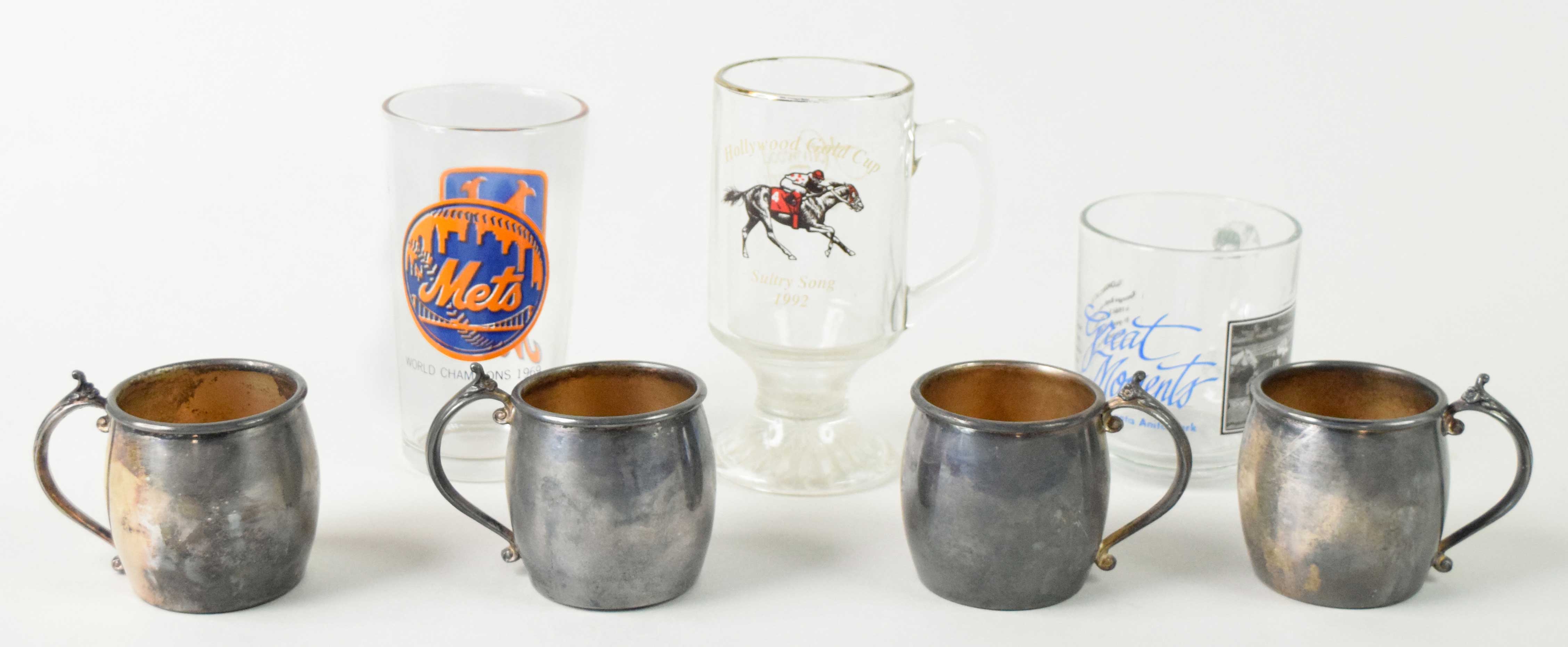 Description:Lot of assorted glasswear - mostly sport related (VG-EX/NM) Includes (17) glasses and (2) shot glasses. One glass contains the World Series Champions from 1927-1954, another US Mens Tennis Champions 1937-1954, Heavyweight Boxing champions 1889-1952, an All time greats of all sports glass, (2) Fred Taylor Ohio State 1961-1962 glasses, and Mets World Series Champions 1969 glass among others. Varrying conditions throughout the lot, but most grades EX overall: VG-EX/NM