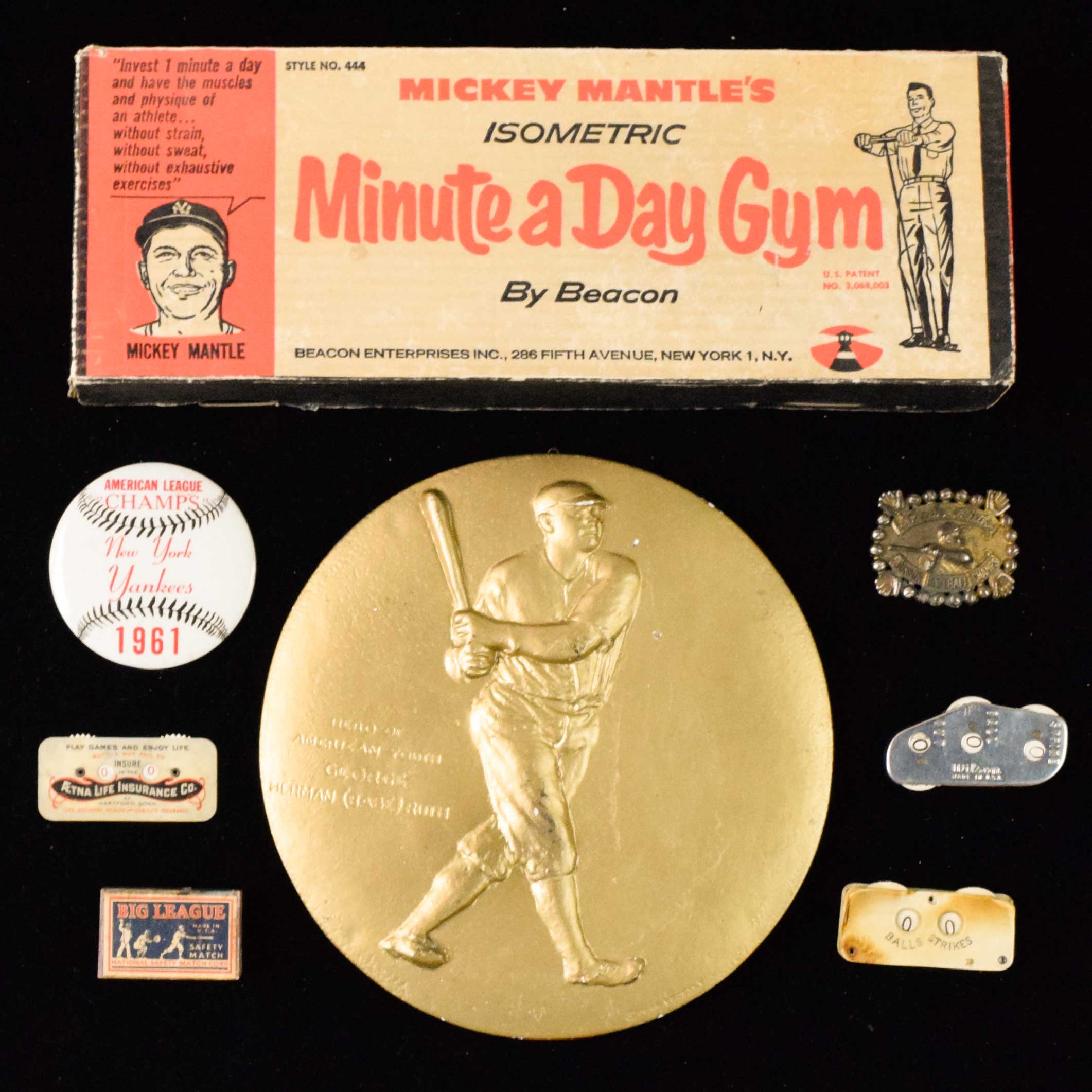 Description:Lot of vintage Baseball memorabilia (mostly Yankees) (EX Overall) Includes Mickey Mantle's Isometric Minute a Day Gym by Beacon, New York Yankees American League Champs 1961 pin, vintage razor blades matches and Mickey Mantle matches, Pin that states "This certifies Babe Ruth shook my hand", Babe Ruth wall plaque (chalk wear), (3) vintage ball strike umpire counters among a few other items. Due to the age of a few of the items there is some storage wear: EX overall