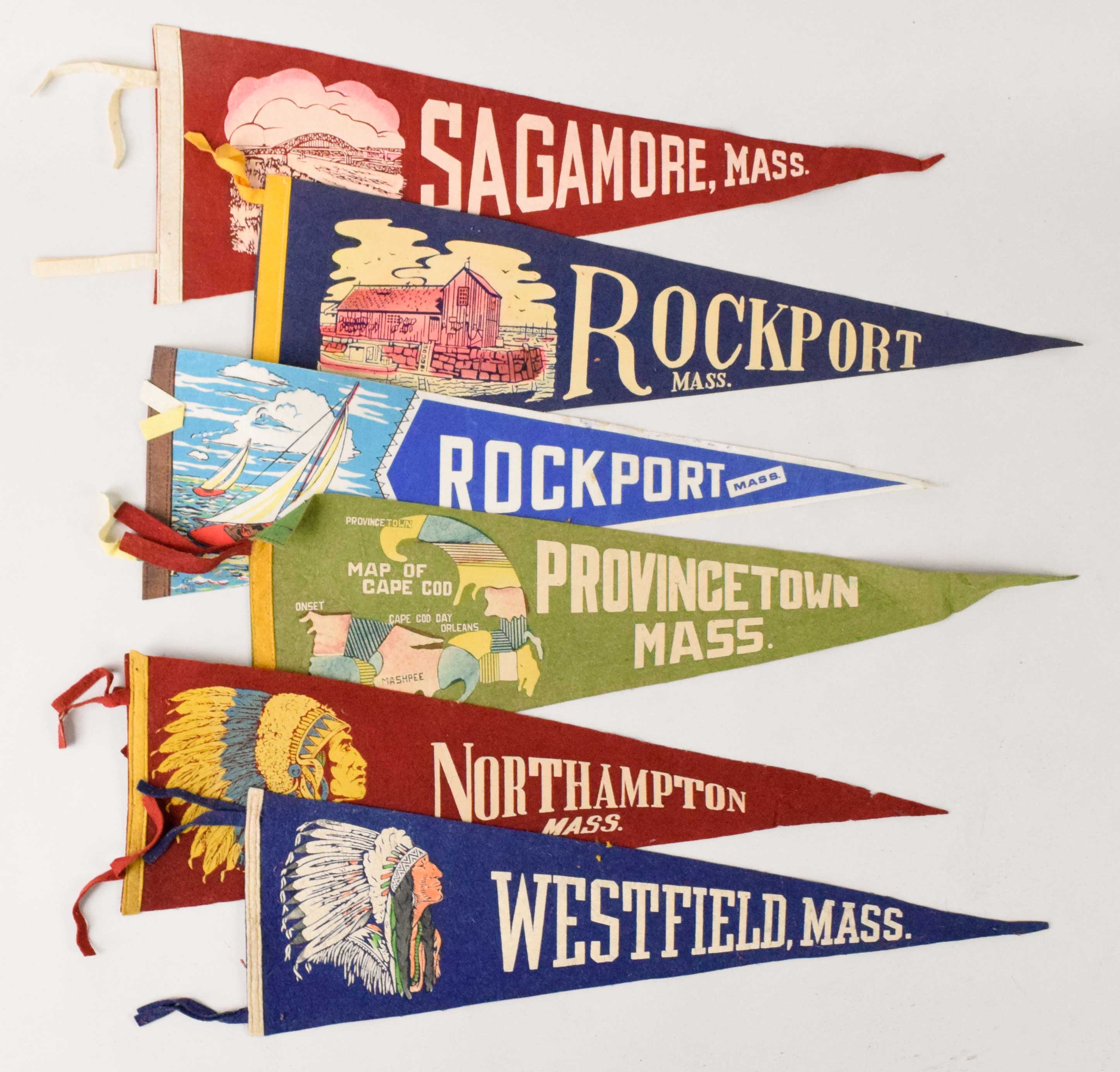 Description:Lot (21) Massachusetts Pennants c. 1950s-90s Most average around 20"-23" (3/4) or so, with some full size and mini pennants mixed in. Includes (5) Plymouth, Norwood, West Springfield, Yarmouth, Stoughton, (2) Gloucester, Lexington, Westfield, Northamption, (4) Provincetown, (2) Rockport, and Sagamore. Most appear to average EX overall. Range: VG/EX-NM