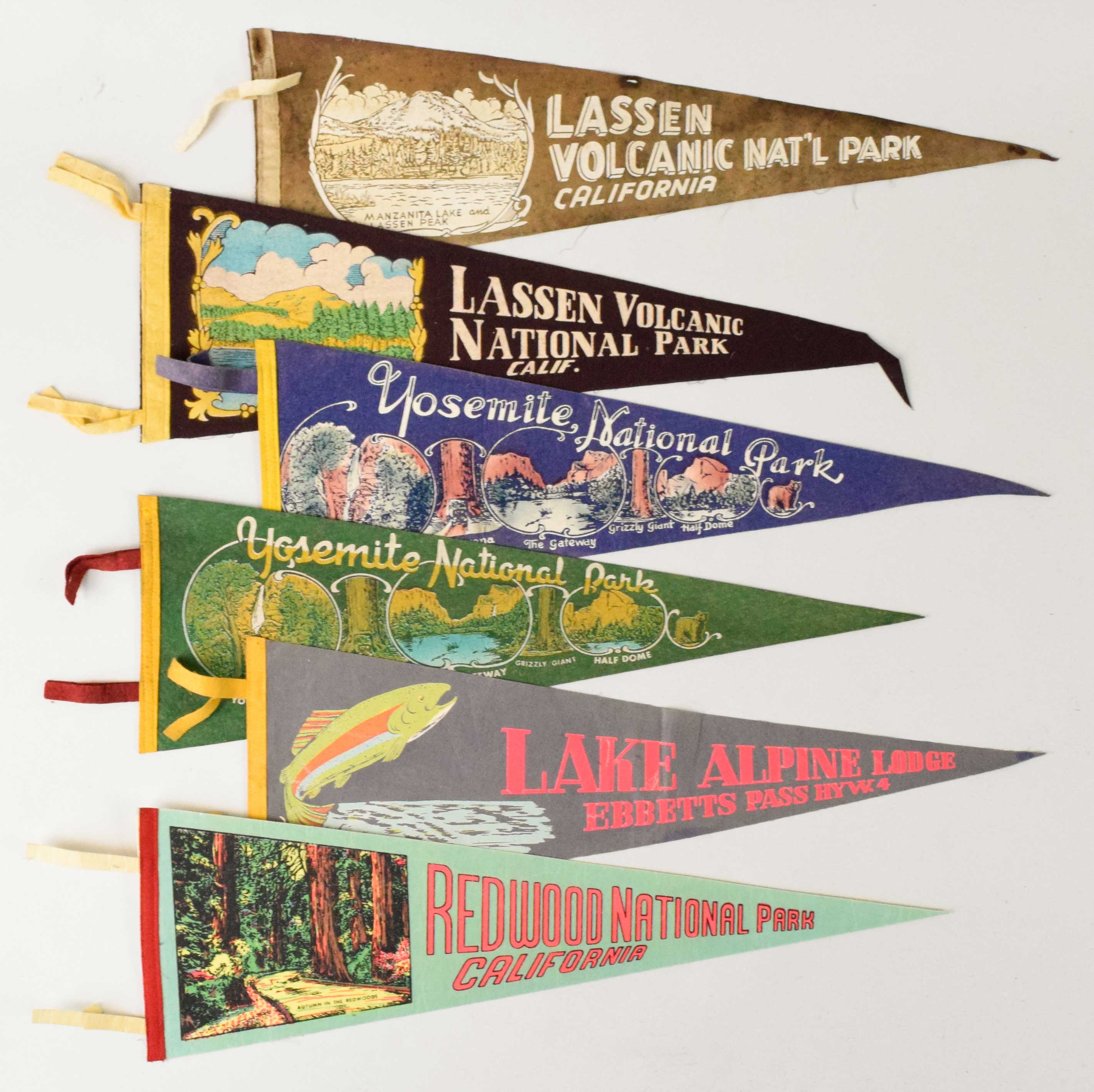Description:Lot (19) California Pennants c. 1950s-90s Most average around 20"-23" (3/4) or so, with some full size and mini pennants mixed in. Includes (7)Yosemite, (4) Lassen Volcanic National Park, (3) Kings Canyon National Park, (3) Sequoia National Park, Redwood National Park, Lake Alpine Lodge. Most appear to average EX overall. Range: VG/EX-NM