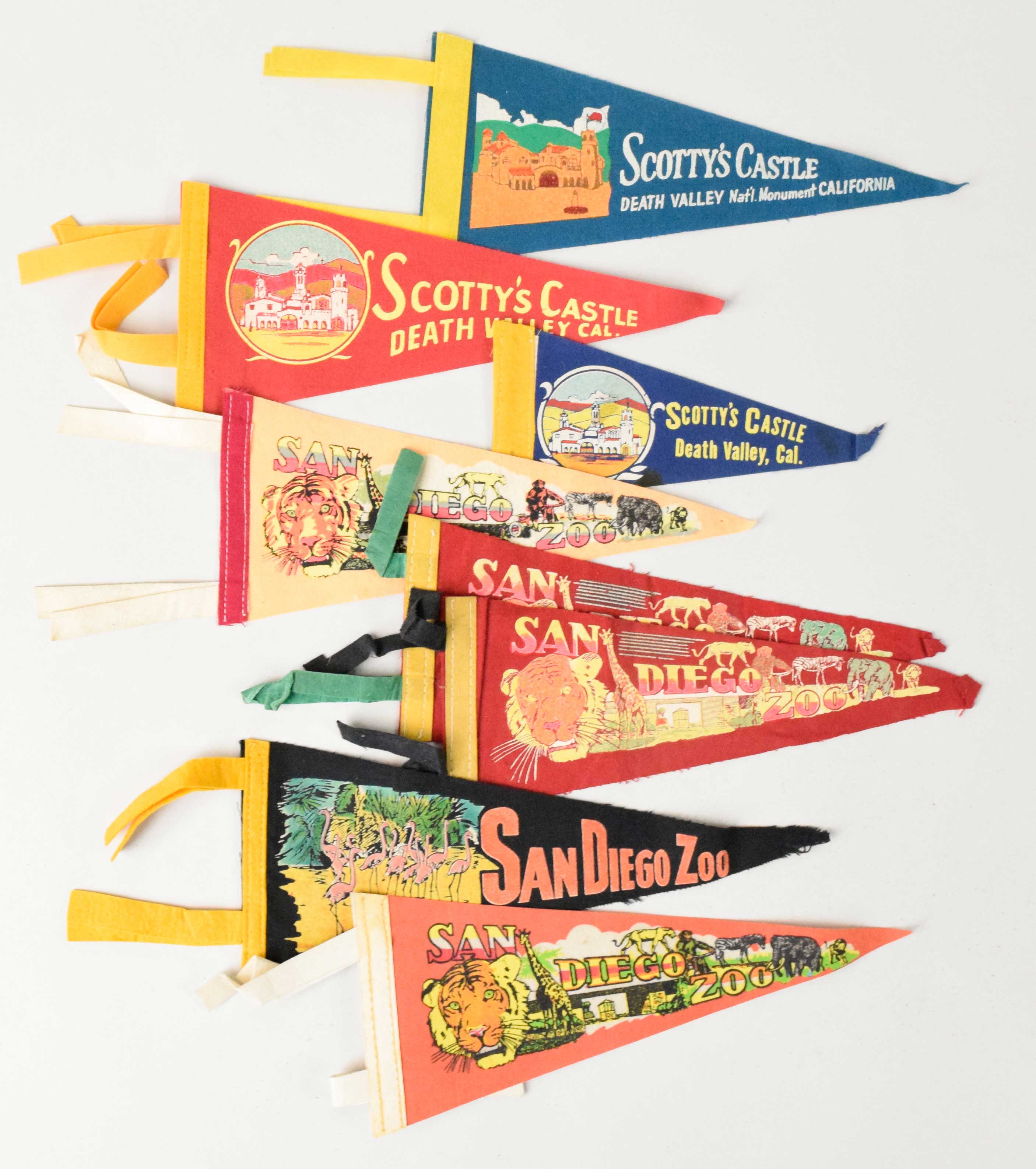 Description:Lot (25) California Mini Pennants c. 1960s-90s (VG/EX-NM) Most average around 20"-23" (3/4) or so, with some full size and mini pennants mixed in. Includes (5) San Diego Zoo, (4) Movieland Wax Museum, (3) Scotty's Castle, Deser View Tower, Pier Point Landing, Marineland, Olvera St, (6) Fishermen's Wharf, Sausalito, Cannery Row, Casade de Fruta, and Heart Castle. Most appear to average EX overall. Range: VG/EX-NM