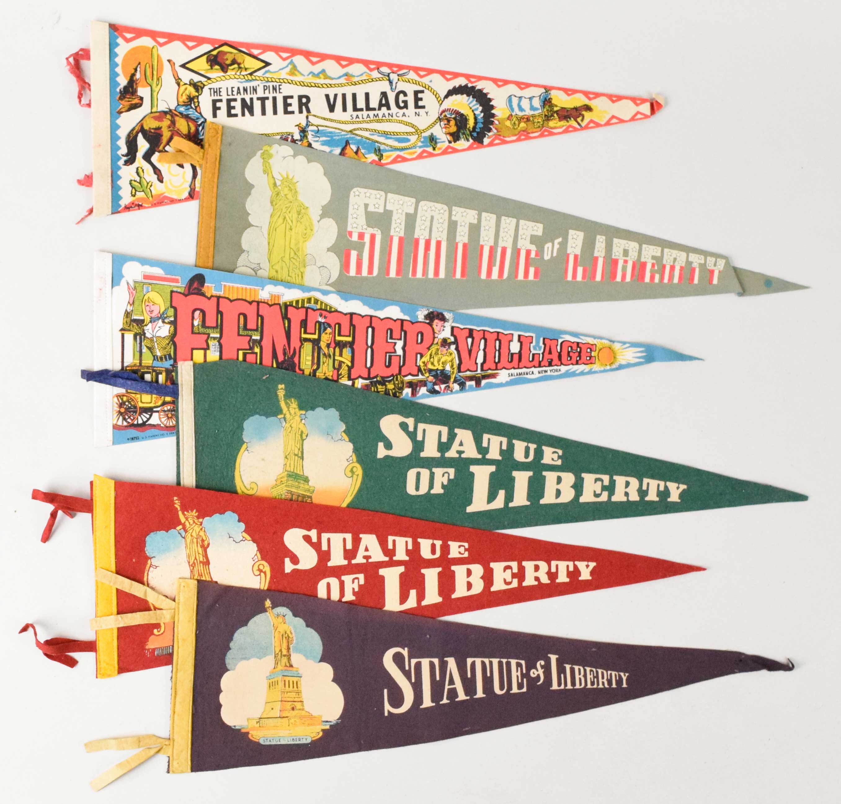 Description:Lot (19) New York Pennants c. 1950s-90s (VG/EX-NM) Most average around 20"-23" (3/4) or so, with some full size and mini pennants mixed in. Includes (2) Salamanca, Statue of Liberty, (7) Statue of liberty, (2) Darien Lake, Naval & Serviceman's Park, Fox's Wild Animal Farm, Fort Rickey Game Farm, (2) Long Island Game Farm, Birch Hill Game Park, 1000 Acres Ranch, and Rockinghorse Ranch. Most appear to average EX overall. Range: VG/EX-NM