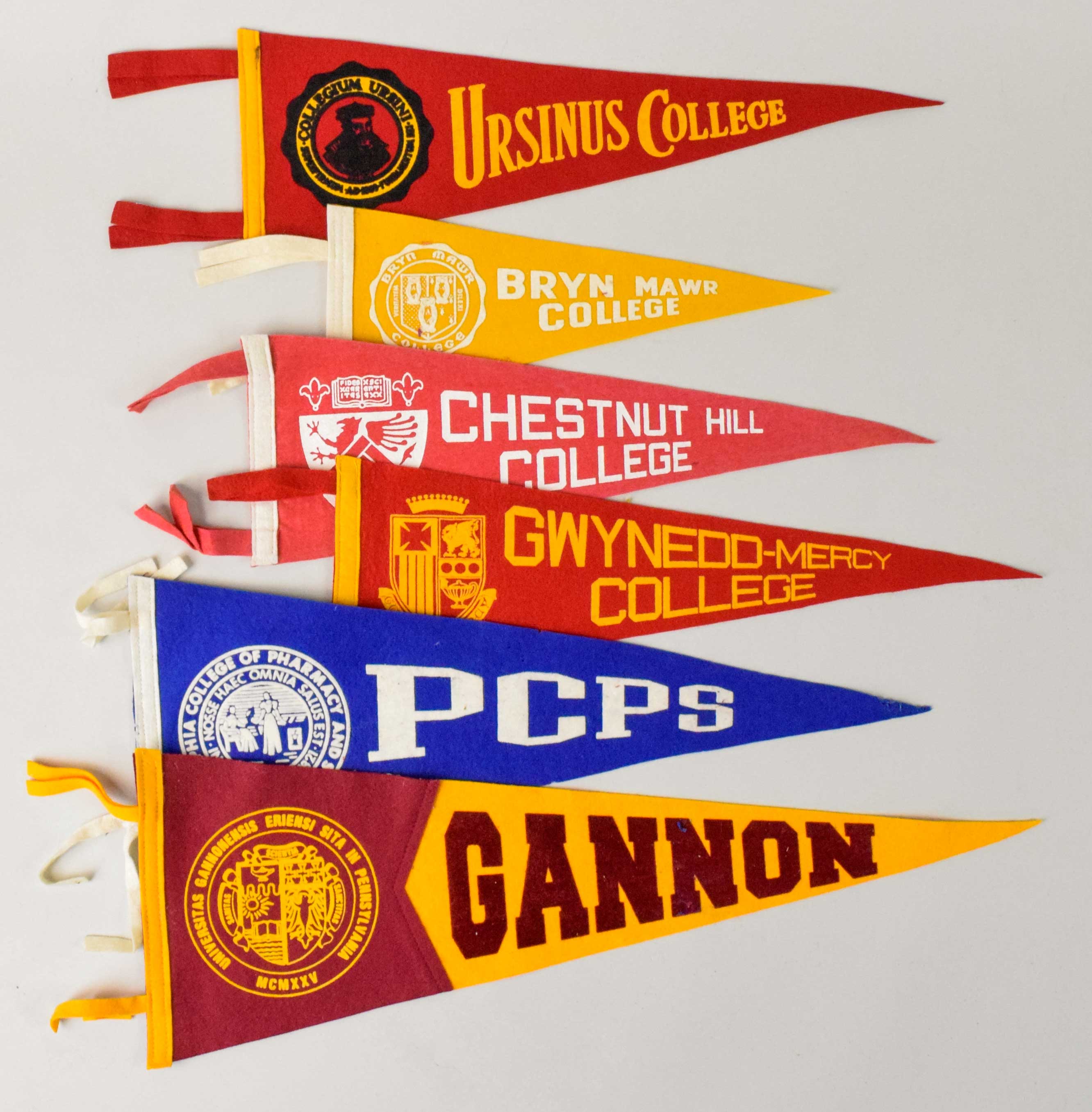 Description:Lot (20) College Pennants c. 1950s-90s (VG/EX-NM) Most are Full sized with smaller around 20-23" mixed in. Includes Chestnut Hill, Bryn Mawr, Washington Jefferson, Robert Morris, Grove City, Westminster, Thiel, (2) Geneva, Swarthmore, Widener, (2) Ursinus, Moravian, Gettysburg, Carlow, Eastern, Gannon, Gwynedd-Mercy, and Philadelphia College of Pharmacy. Most appear to average EX overall. Range: VG/EX-NM