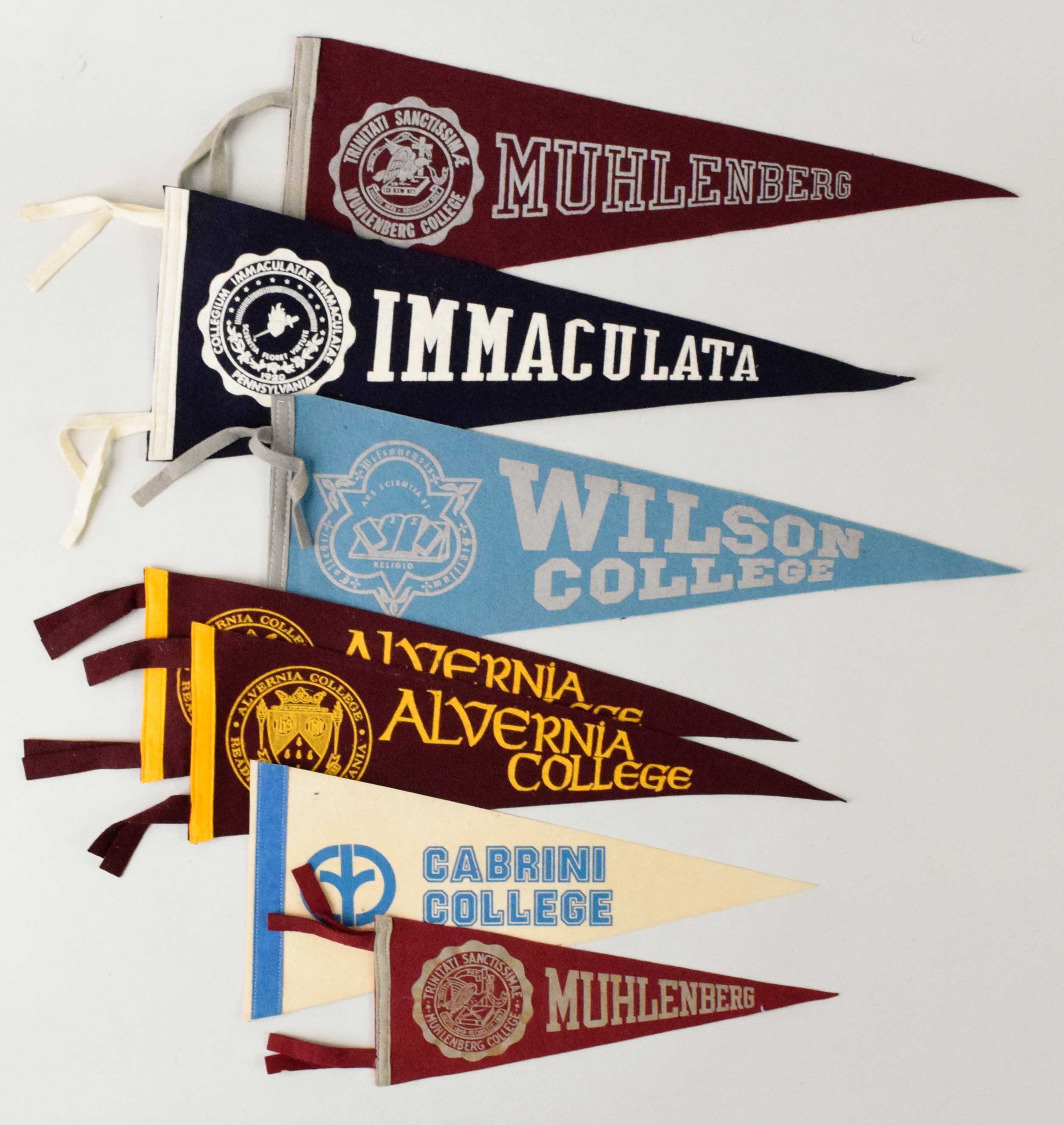 Description:Lot (20) College Pennants c. 1950s-90s (VG/EX-NM) Most are Full sized with smaller around 20-23" mixed in. Includes Cabrini, (2) Alvernia, Wilson, Immaculata, Beaver, (3) York, Spring Garden, Thomas Jefferson, Wilkes, (2) Muhlenburg, Albright, Lebanon Valley, Juniata, Lycoming, Duquesne, and Delaware Valley College. Most appear to average EX overall. Range: VG/EX-NM