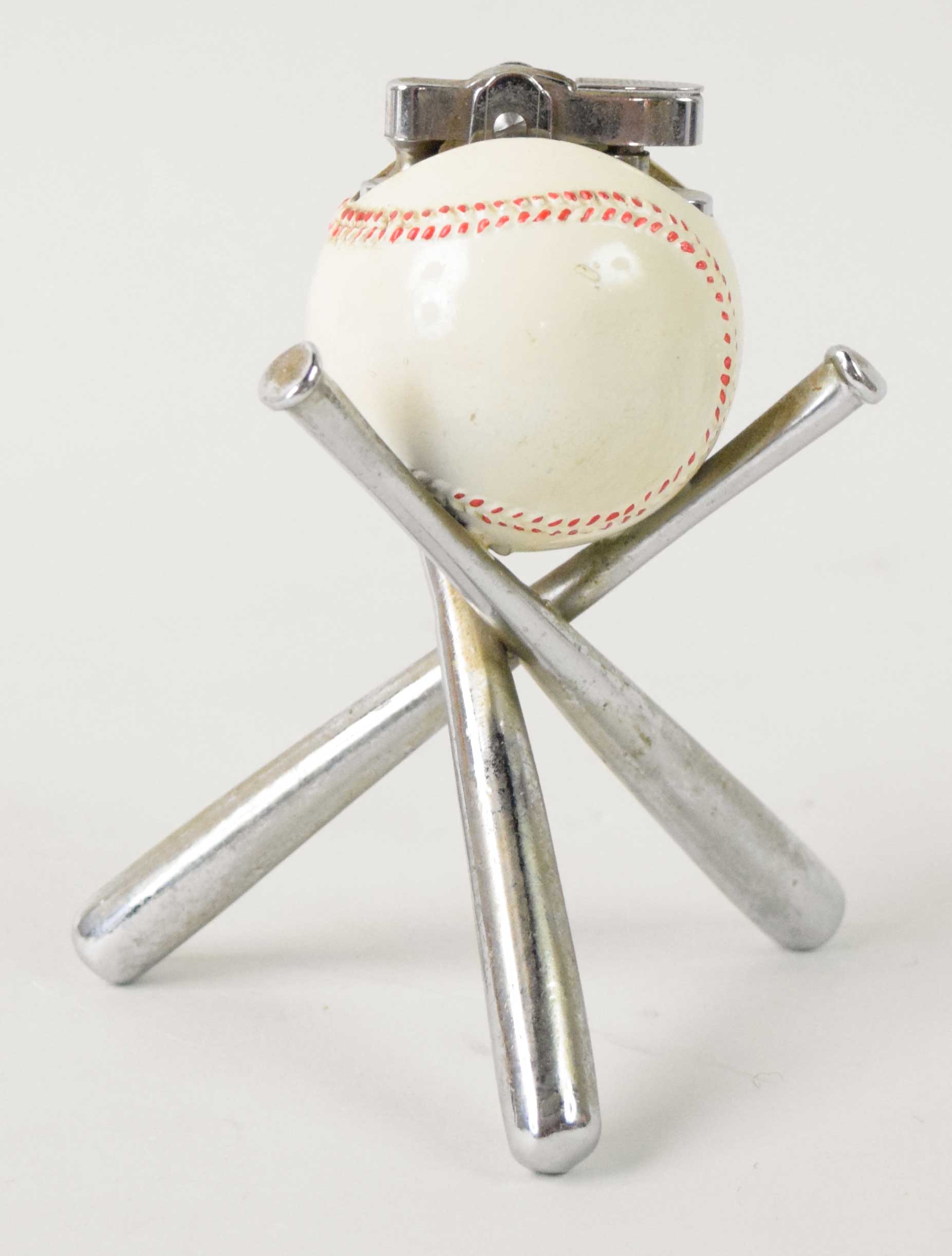 Description:Vintage baseball lighter, c.1950s (EX/MT-NM). Approx. 4.5" tall, with the lighter inside of a metal baseball sitting on top of crossed bats: EX/MT-NM