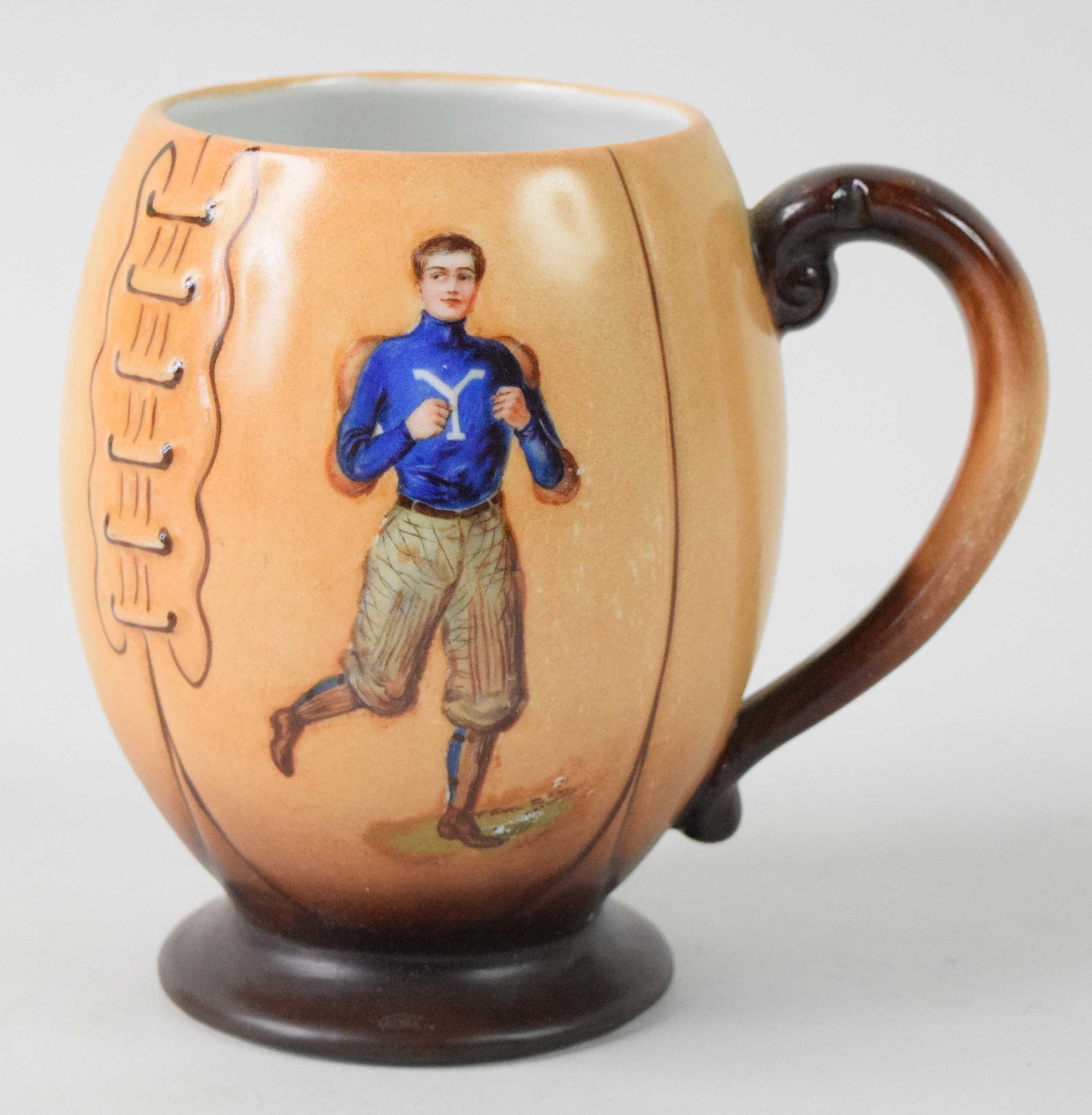 Description:Yale University decorative football mug, c.1905 (EX/MT). Measures approx. 5" tall, with F.Earl Christy football player design on one side, and Yale flag on the opposite side. T.Maddocks Sons Co. stamping is on the base, with Jan 24th 1905 patent date: EX/MT