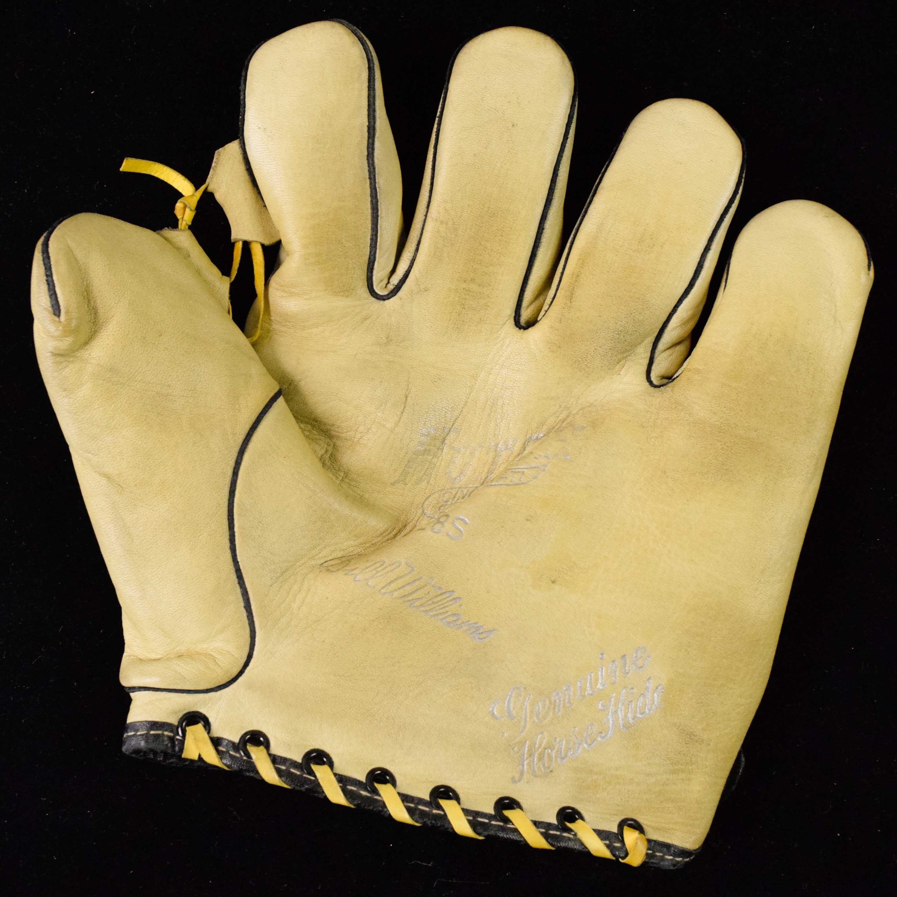 Description:Bill Williams vintage store model baseball glove, c.1940s (EX/MT). Hutch 28S model glove with Bill Williams facsimile signature stamped at the bottom of the pocket. Appears only lightly used, if at all, with some minor discoloration: EX/MT