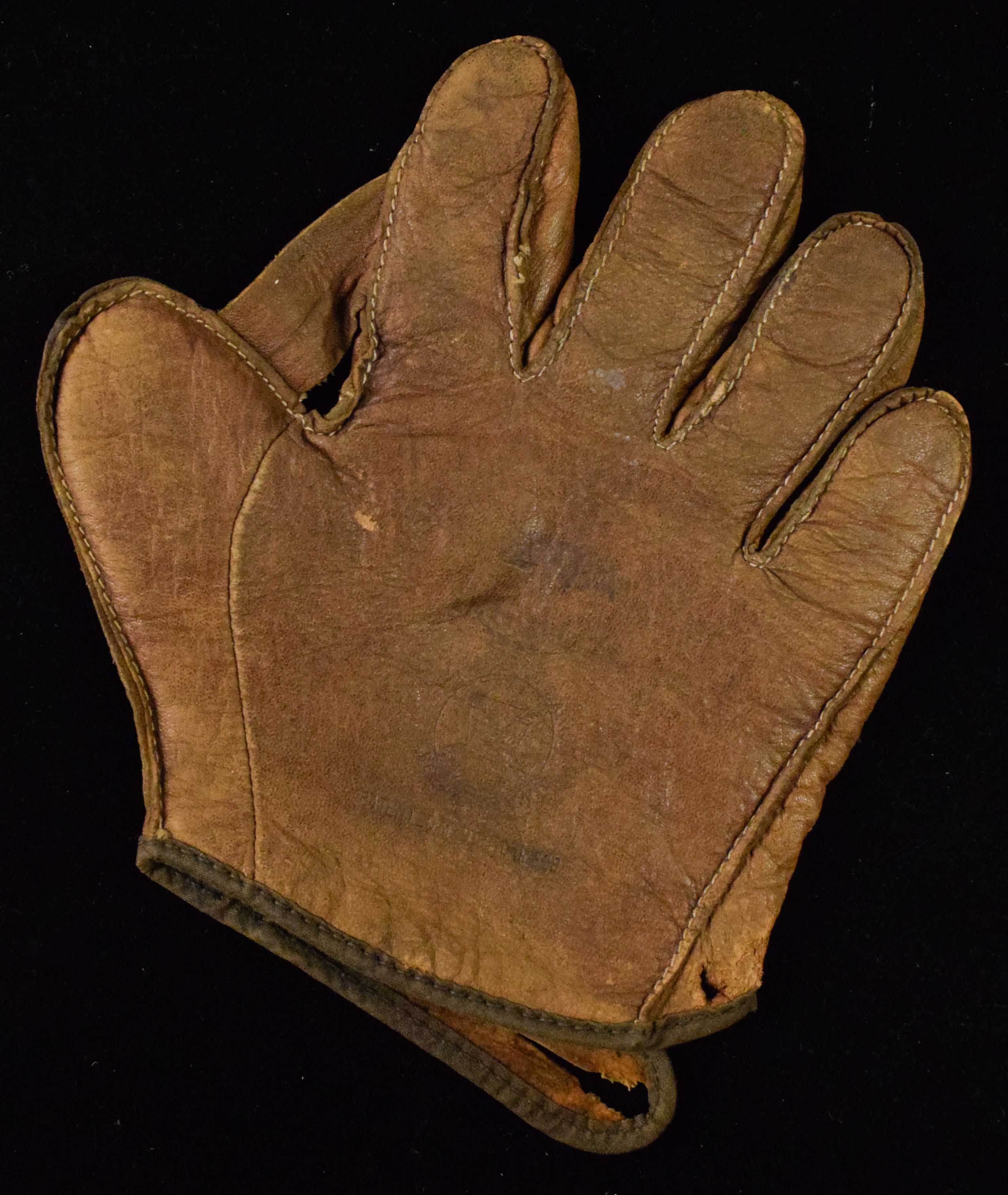 Description:Reach youth fielder's glove, c.1908-1910s (VG). Reach logo stamping is still visible in the pocket, with what appears to be a faded Z9A model number above, and March 10th 1908 patent date below. Button is missing for the wrist strap: VG