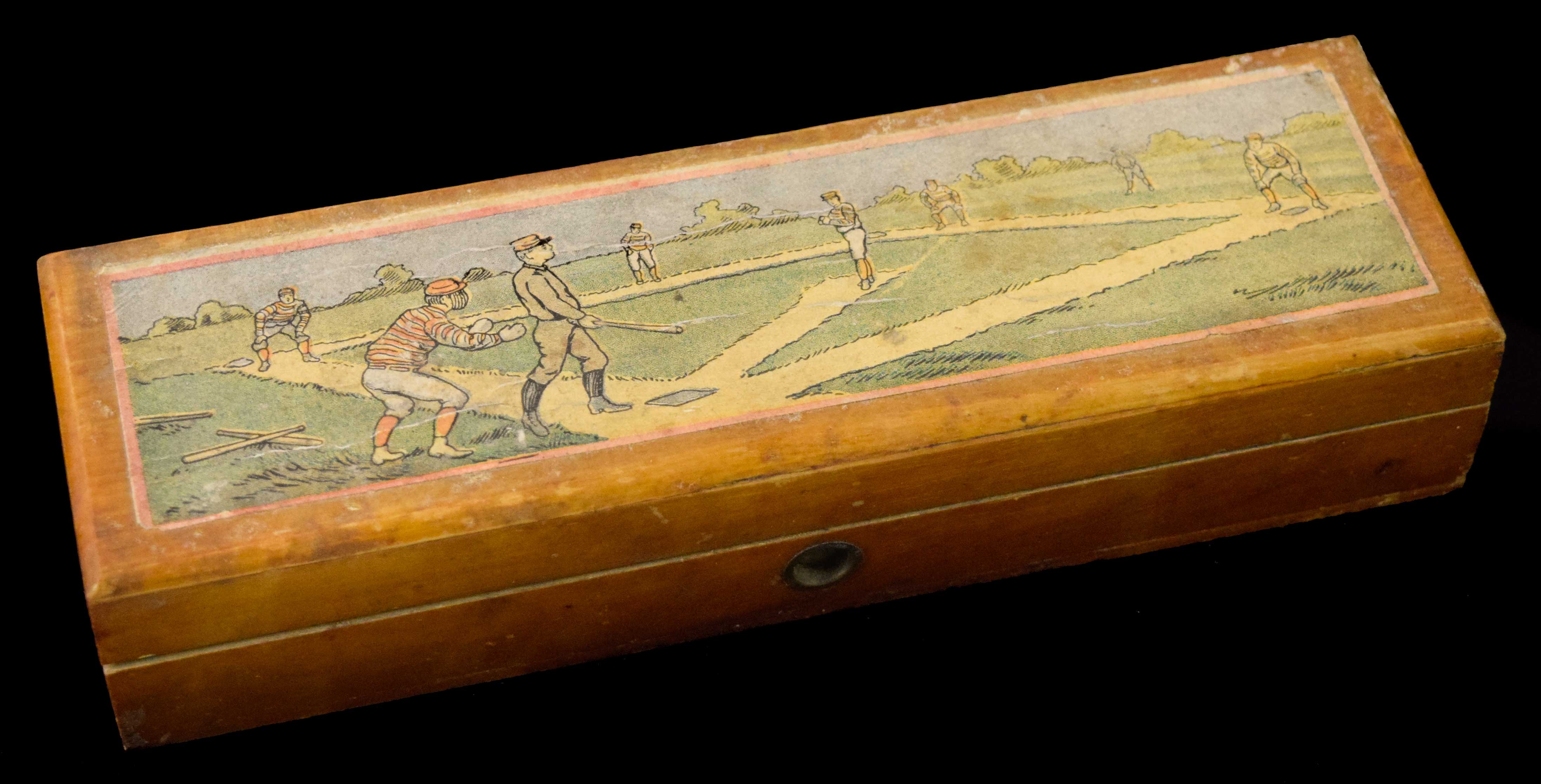 Description:Baseball decorated pencil box, c.1890s-1900s (VG/EX-EX). Wooden box with hinged lid featuring a lithographic baseball scene. Areas of light creasing to the paper, and the lock no longer functions. There is some writing inside under the lid, and still contains some old pencils: VG/EX-EX