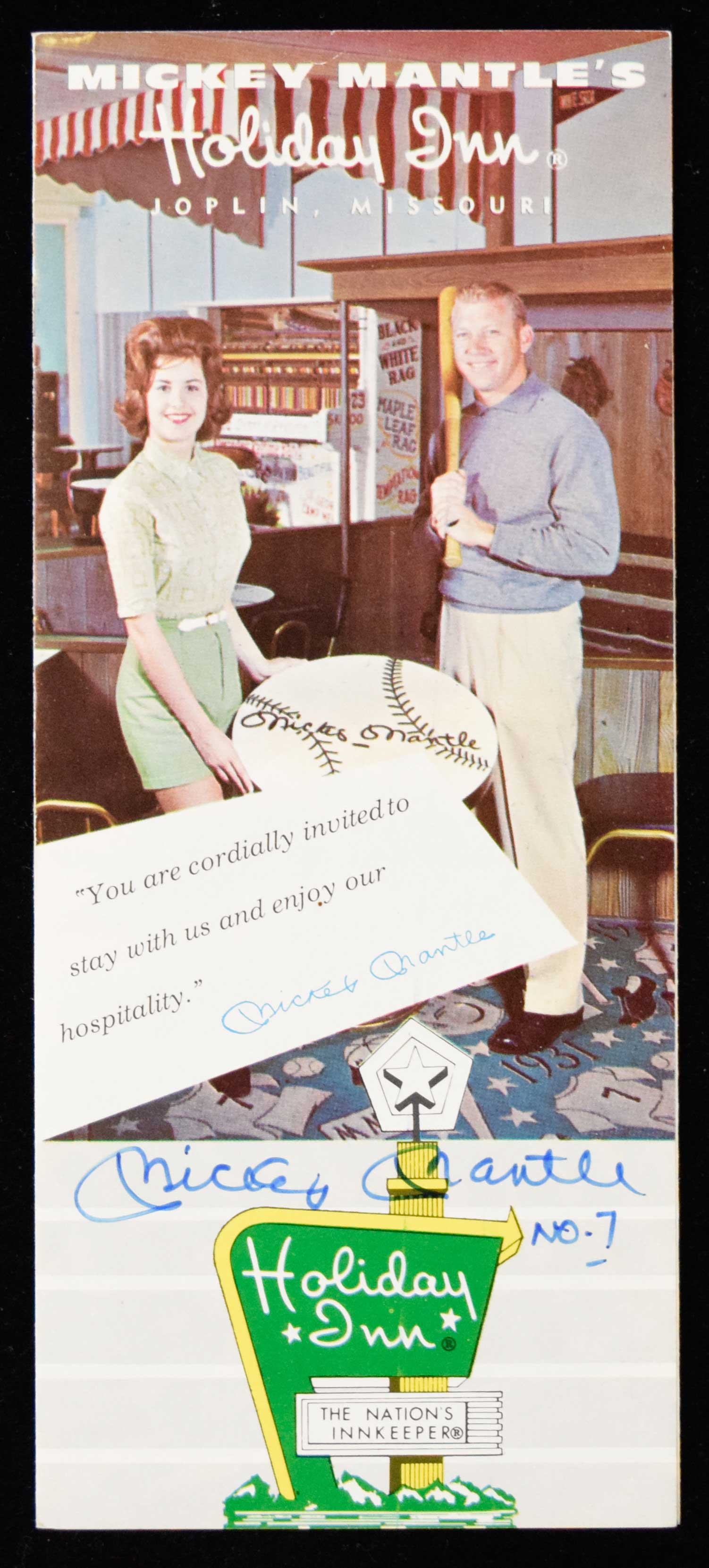 Description:Mickey Mantle signed and inscribed Mickey Mantle's Holiday Inn brochure (NM). Mantle signed the cover in blue marker and added "NO. 7" inscription. Signature rates 9 out of 10: NM