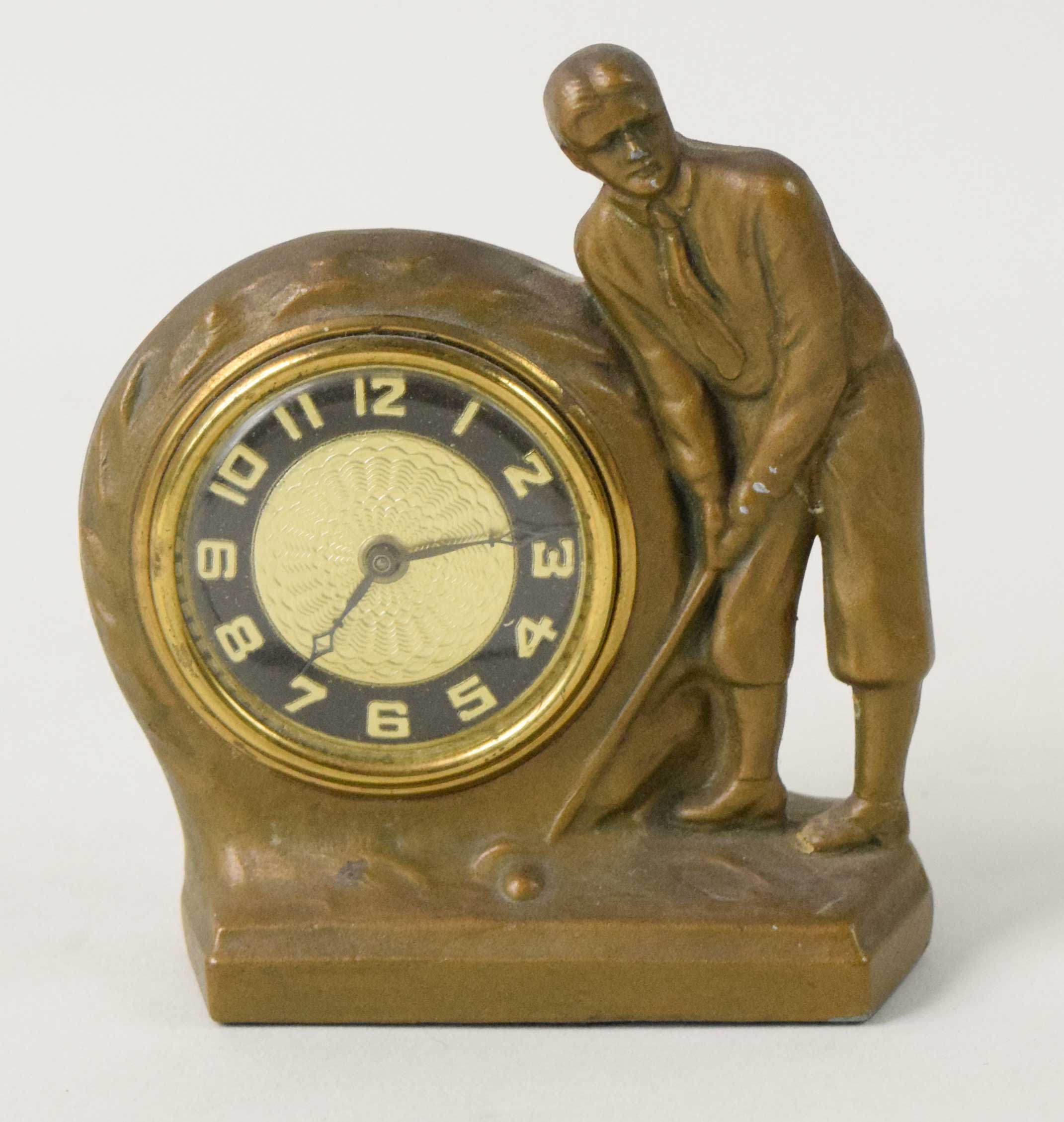 Description:Vintage figural golfer desk clock, c.1930s (EX/MT). Approx. 3.5"x4" desk clock with a figural golfer resembling Bobby Jones next to the clock. Still ticks when wound, but missing key to turn the hands: EX/MT