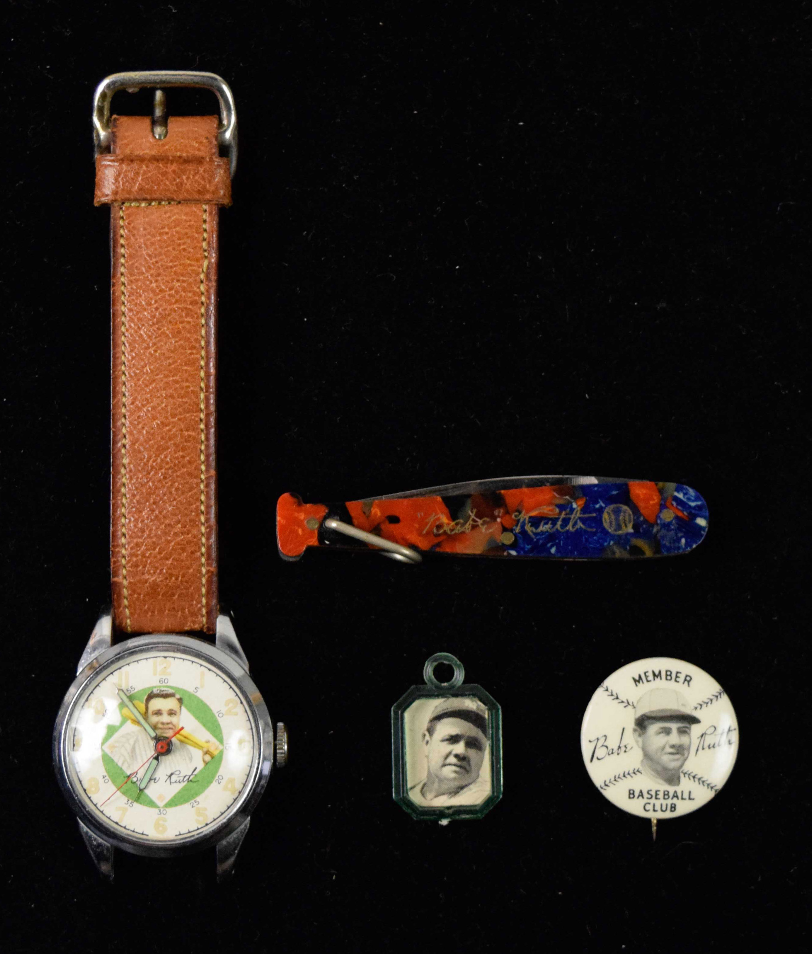 Babe Ruth vintage Quaker Oats pin, watch, locket, and pocketknife (VG-NM). Includes 1934 Babe Ruth Baseball Club membership pin by Quaker Oats (EX/MT), c.mid 1930s Babe Ruth pocketknife by Quaker Oats (EX-EX/MT), c.1949-53 Babe Ruth watch by Exacta Time Corp. (VG missing lug attachment on one side), and c.1950 Babe Ruth vending machine locket (NM).
