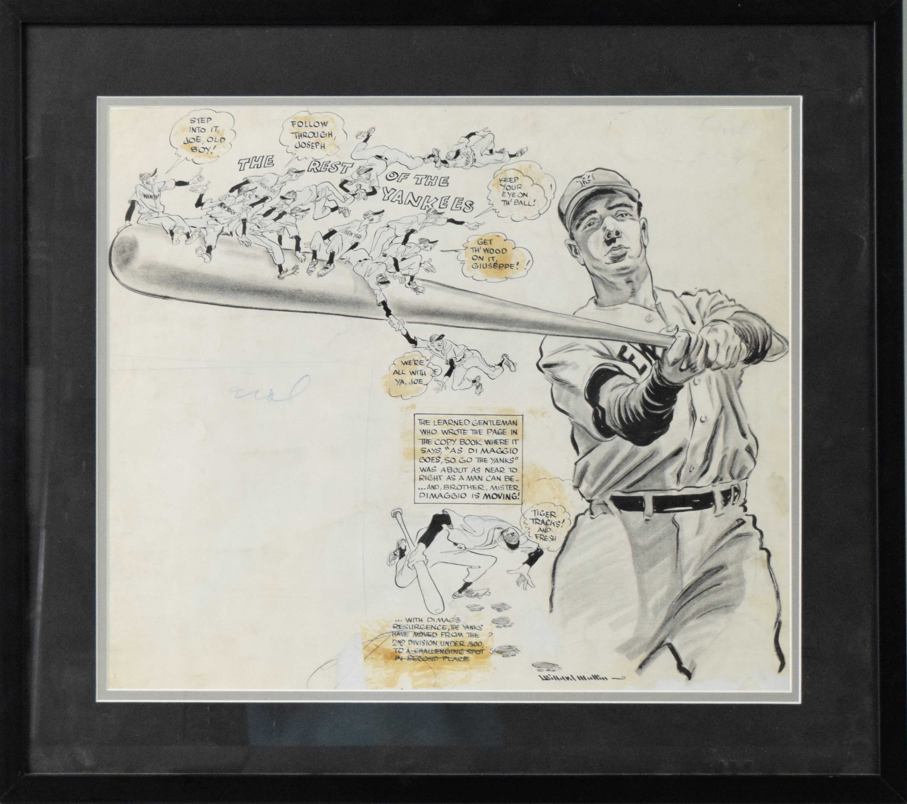 Description:1950s Willard Mullin original illustration artwork featuring Joe DiMaggio (VG-EX) Original piece featuring a large rendering of DiMaggio along with related graphics/text. Framed to 20.5"x23" with some light visible soiling/toning. Signed "Willard Mullin" at lower right: VG-EX ($400-$600)