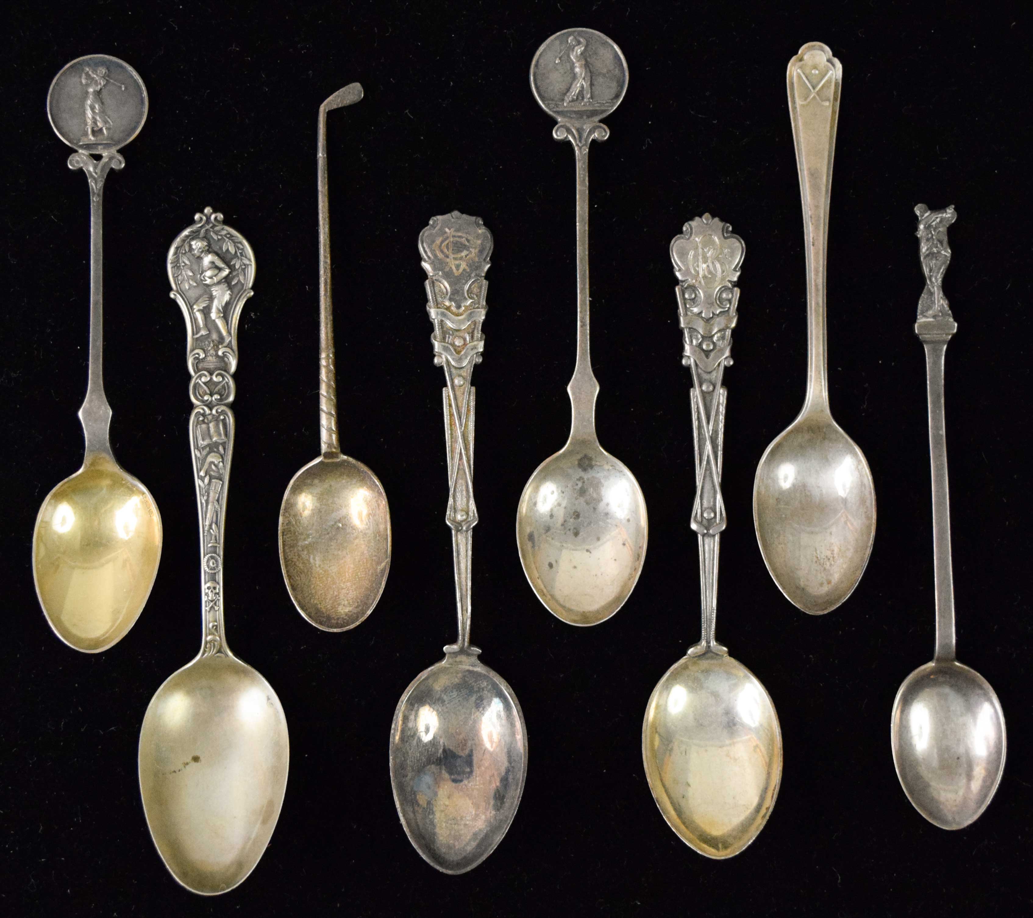 Description:Lot of (24) vintage sports themed spoons, c.early 1900s (VG/EX-EX/MT). Includes a football spoon marked "STERLING". Remainder are all golf themed, and are not marked Sterling, but have various maker markings on them: VG/EX-EX/MT