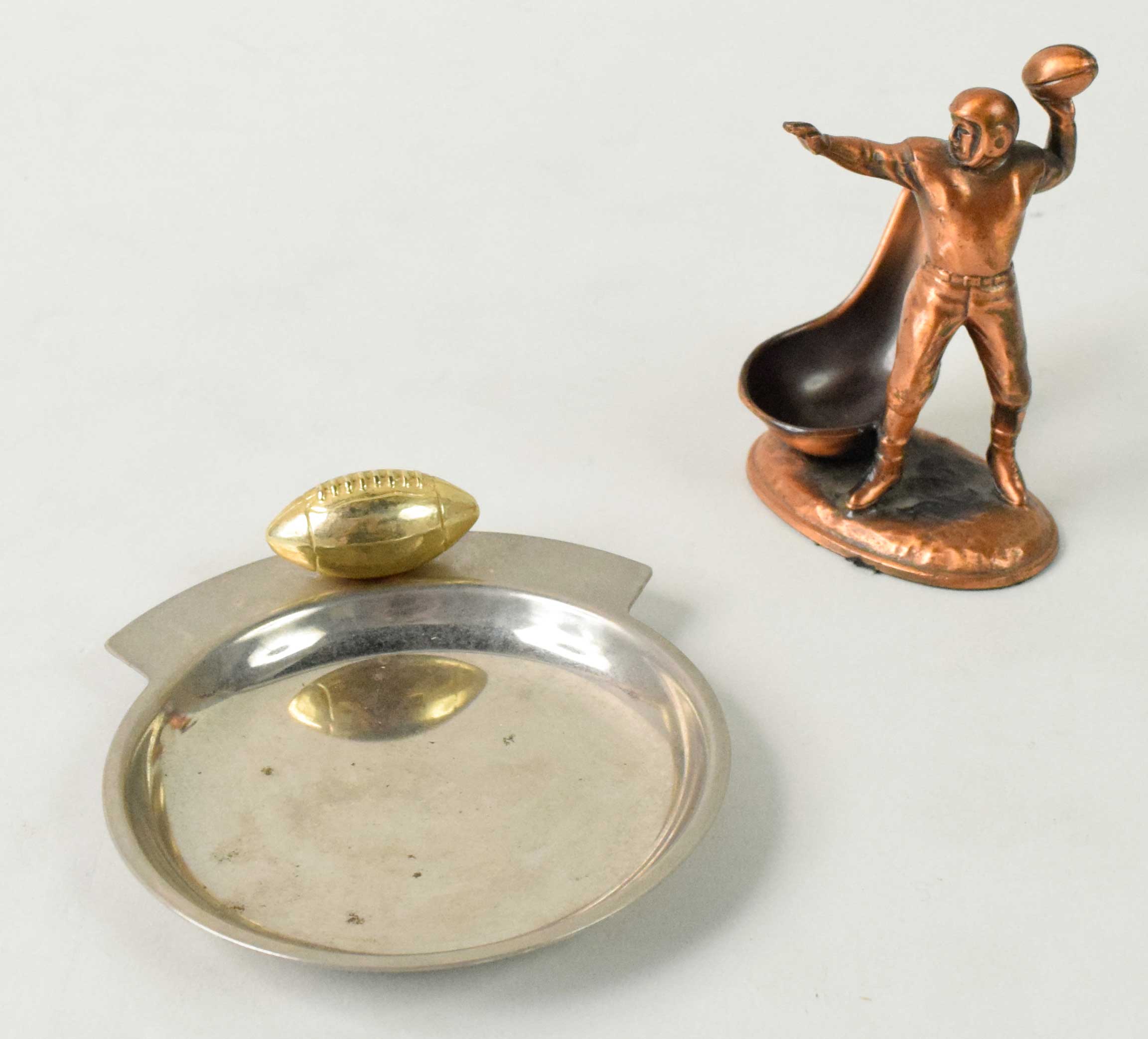 Description:Vintage football themed pipe stand and ashtray (EX-EX/MT). Includes 4" tall figural football player pipe stand, and 5" diameter ashtray with a metal football at the edge: EX-EX/MT