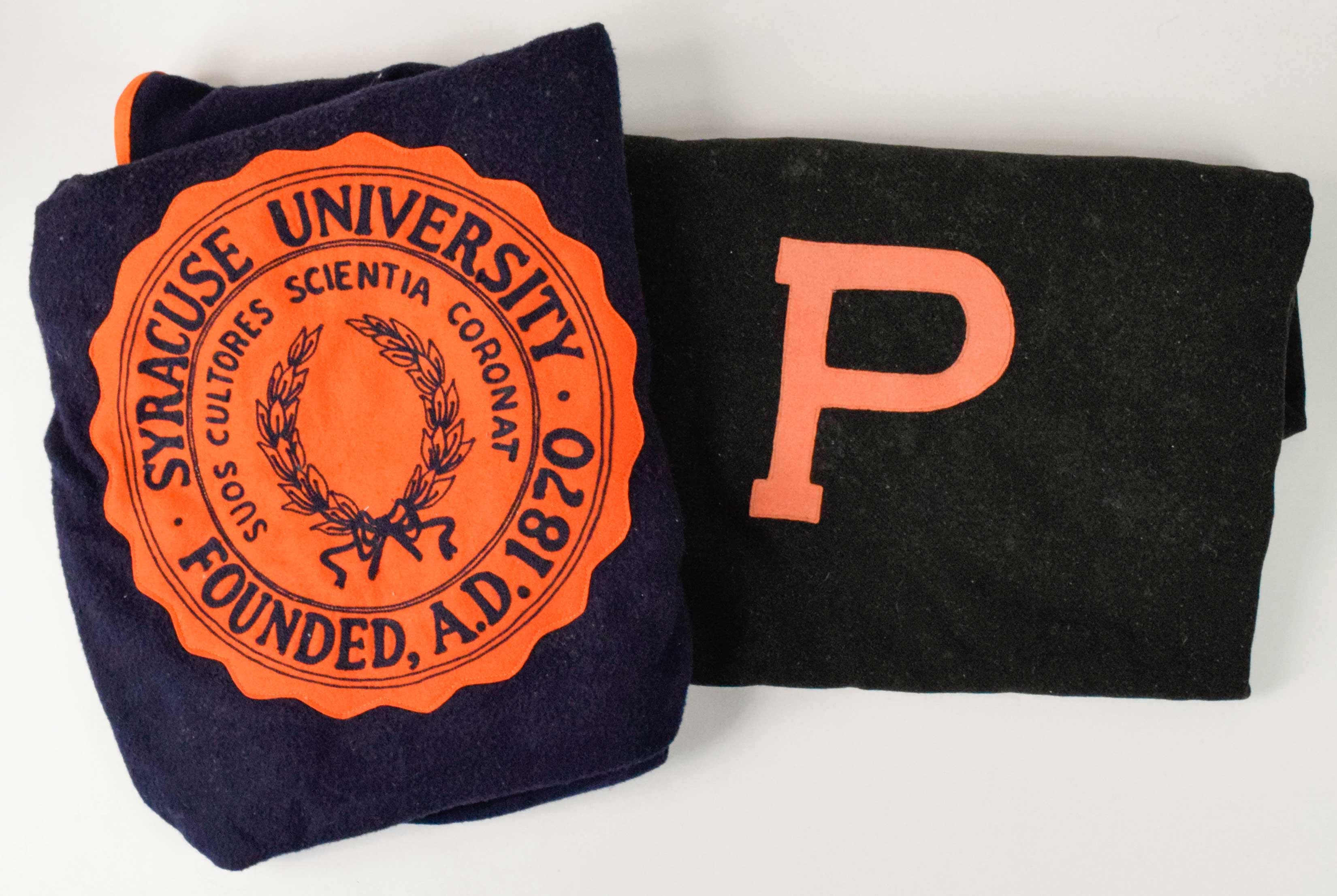 Description:Lot of (3) vintage college blankets, c.1930s-40s (EX-EX/MT). Includes c.1930s-40s approx. 69"x76" "P" blanket by Esmond Blankets (likely Princeton based on color scheme), 54"x76" 1941 Syracuse blanket by Artcraft with the name Phyllis Dungey chain stitched at the corner, and c.1940s approx. 56"x68" "I" blanket (possibly Iowa based on color scheme). Scattered staining, but not extreme: EX-EX/MT