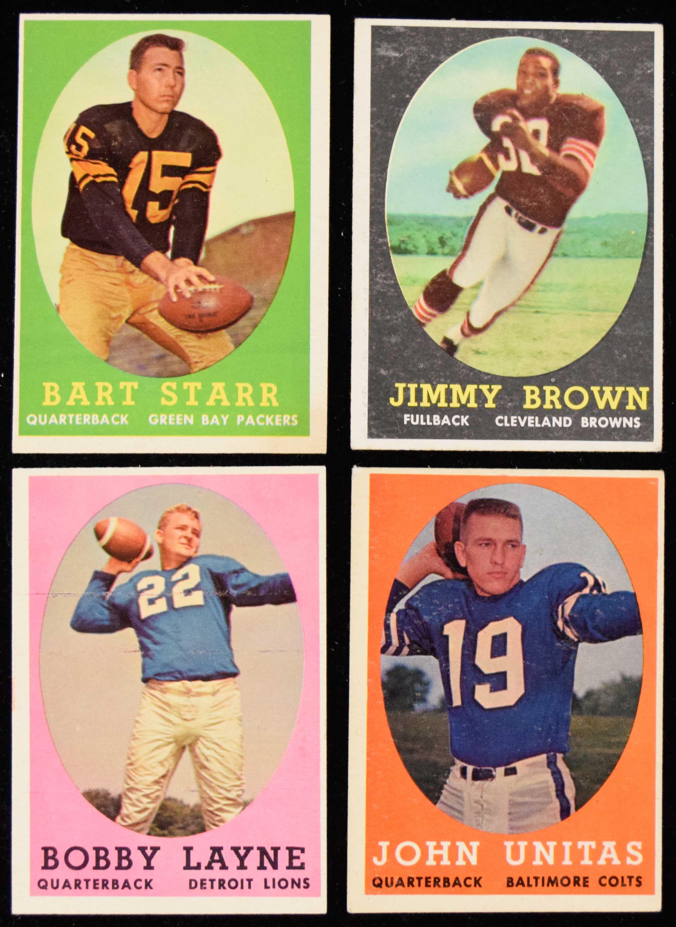 Description:1958 Topps Football complete set (132 cards) (Avg. EX, see description) Jim Brown Rookie has been trimmed. Solid mid grade condition with average EX grade and VG-EX/MT general range. Please note that centering card be an issue and many cards which would otherwise carry a higher technical grade are lowered by centering. Keys: #2 Layne (EX/MT OC, print defect), 22 Unitas (VG/EX), 62 Brown (trimmed), 66 Starr (EX/MT OC), 73 Gifford (GD/VG), 90 Jurgenson (VG), 120 Berry (EX), and 129 Blanda (EX/MT-NM miscut): Avg. EX, see description ($750-$1,000)
