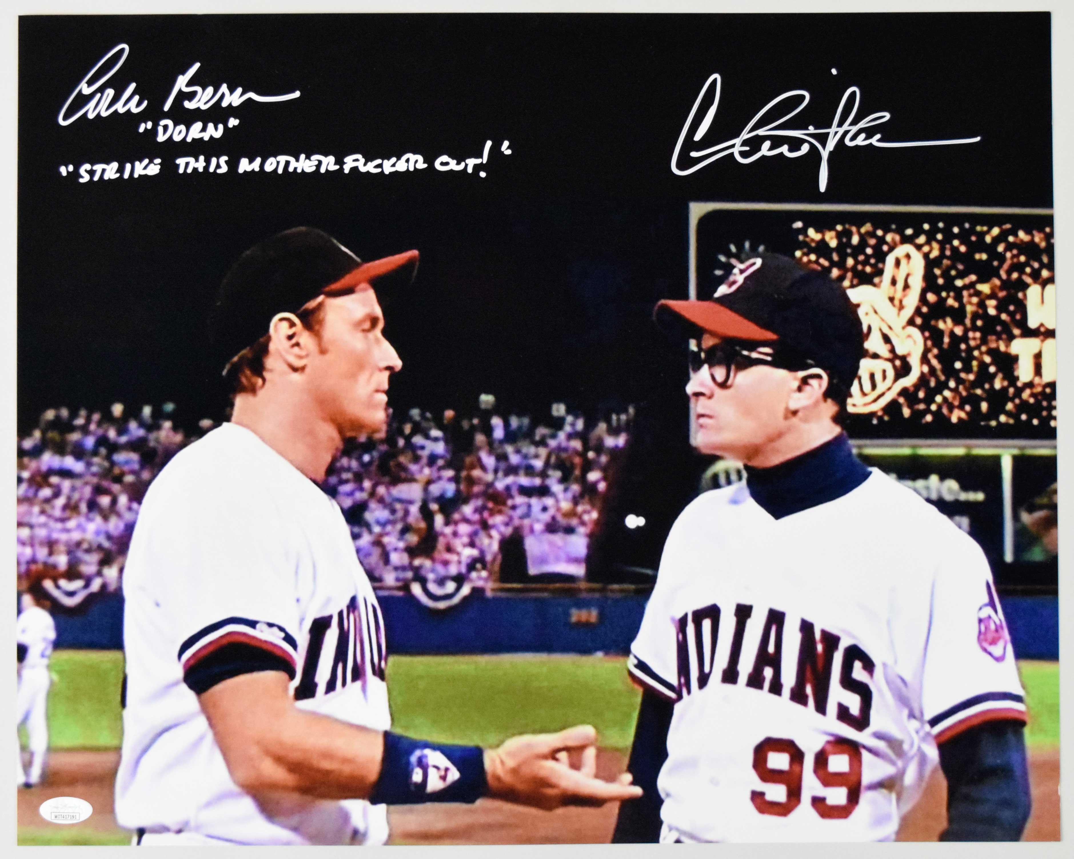 Description:Corbin Bernsen & Charlie Sheen dual-signed 16"x20" "Major League" photo with expletive inscription - JSA (NM). Bernsen and Sheen both signed the photo in white paint pen, with Bernsen adding "Dorn" and "Strike This Motherf***er Out" inscriptions. Signatures rate 9 to 10 out of 10. JSA serial #ed sticker is on the photo: NM